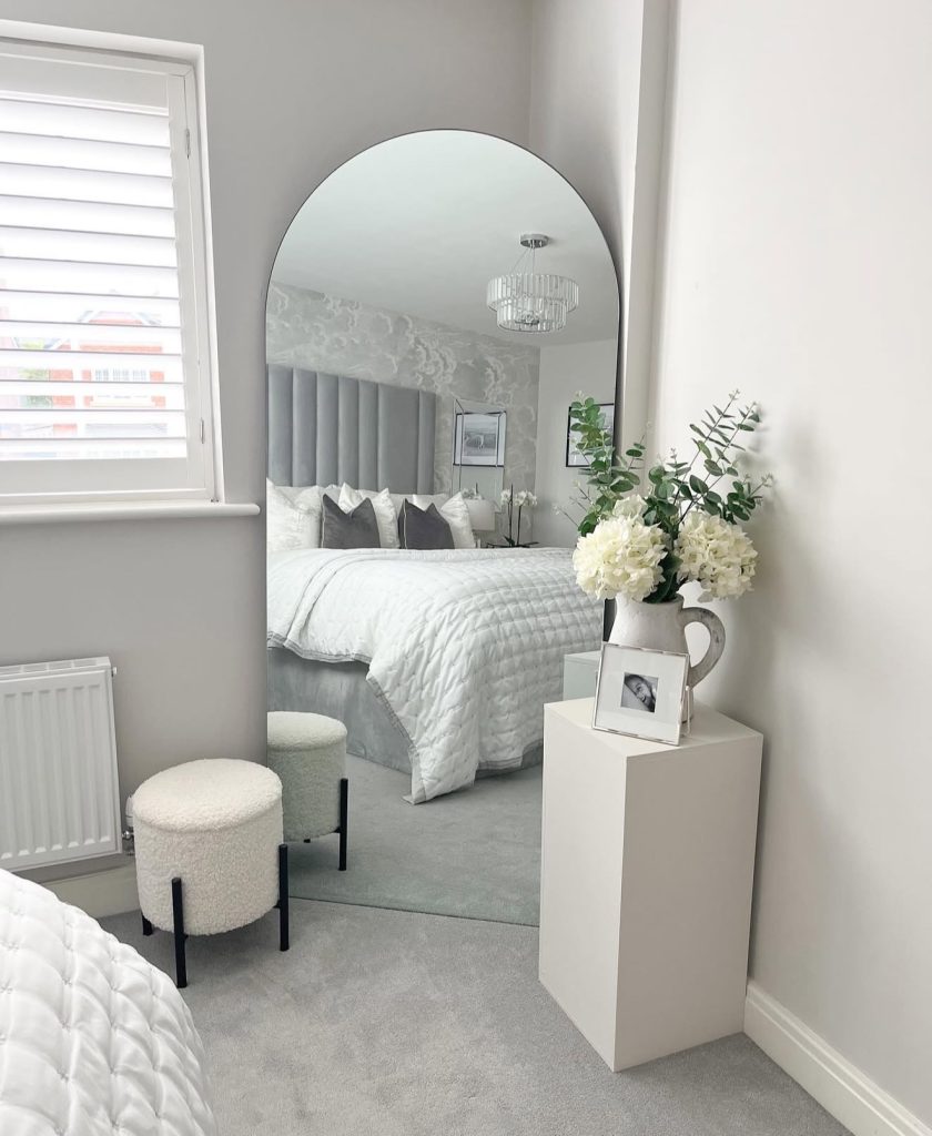 The combination of grey and white with soft textures lends this bedroom a clean and polished look, giving it an airy and uplifting atmosphere, making it ideal for spring. The tall arched mirror is a smart design choice for small rooms, as it beautifully reflects and amplifies light. The soft florals, along with light décor accents, clinch a diffused, light, feminine look for the calm and airy ambience. The textured headboard and quilted bedding infuse harmony with the light palette, making the decor suitable for teenage girls or anyone who prefers textures that add a light and graceful aesthetic rather than a heavier one. Overall, the decor of this bedroom is soothing, elegant, and modern, confirming the 2026 aesthetic of understated luxury.