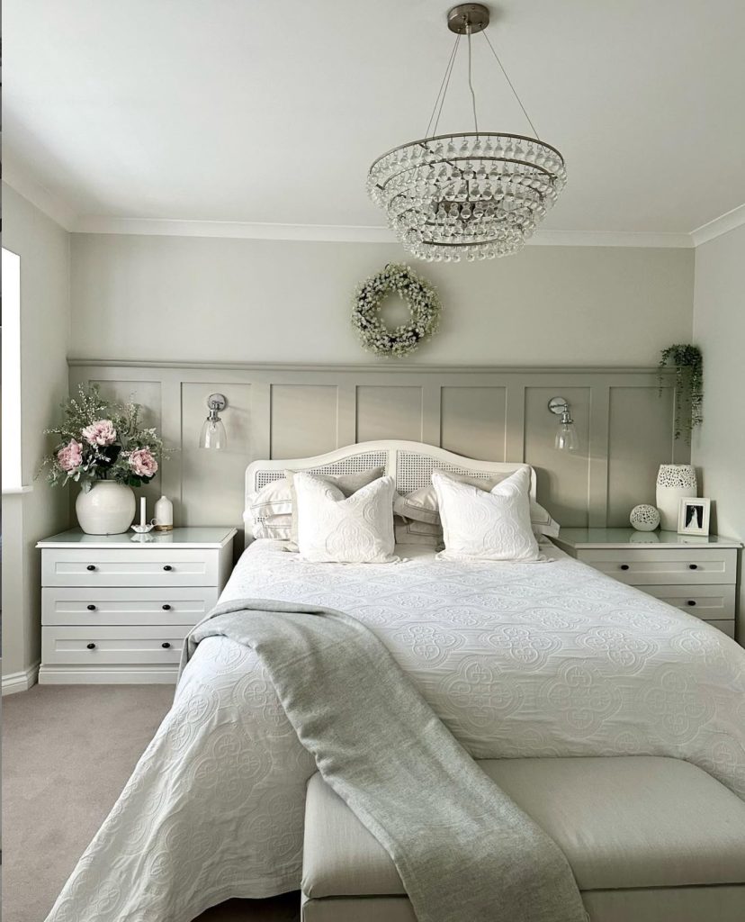 This refined interior captures timeless beauty through its white and grey harmony. Paneled walls and crystal lighting create a luxury hotel-like ambiance, while soft fabrics and layered bedding evoke the feeling of calm mornings and quiet evenings. Perfect for couples who love sophistication without excess, the palette’s beige and undertones add just enough warmth to balance the coolness of grey. Designers like Joanna Gaines often use this mix to maintain visual brightness while preserving coziness. The matching nightstands and fresh florals reinforce symmetry—a key technique for achieving a serene, balanced composition in bedroom decor.