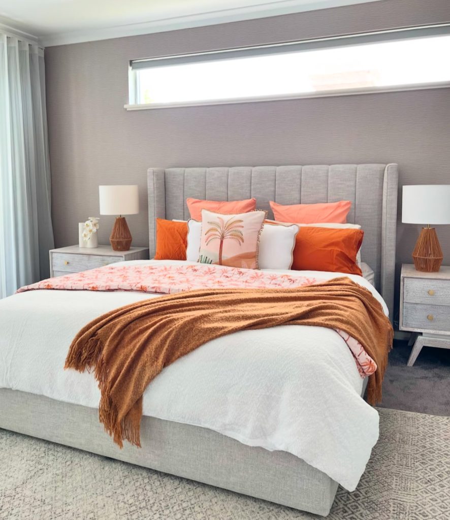 This design shows how easily grey can take on personality with a pop of color, using warm orange textiles to brighten the entire space. The soft grey bed frame and walls create a neutral backdrop that allows the bold accents to shine without feeling overwhelming. Warm-toned pillows and throws introduce a playful, sunny energy that feels inviting and uplifting. The balance of textures—from crisp bedding to cozy blankets—keeps the look feeling layered and intentional. This idea works beautifully for teens, young adults, or anyone wanting a cheerful twist on a traditional grey palette.