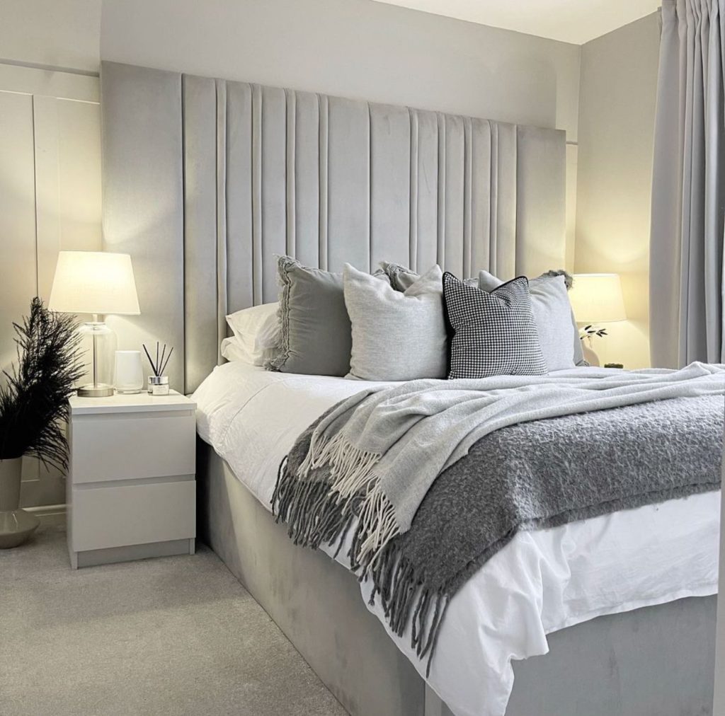 This room embraces a plush, layered approach to grey, perfect for anyone who loves an aesthetic cozy atmosphere. The tall upholstered headboard adds height and sophistication, setting the tone for a calm and curated look. Layered throws and cushions in varying grey shades create depth without introducing competing colors. Soft lighting on both sides of the bed enhances the intimate feel, making the space ideal for couples seeking comfort and style. The monochromatic palette brings a relaxed elegance that doesn’t sacrifice warmth.
