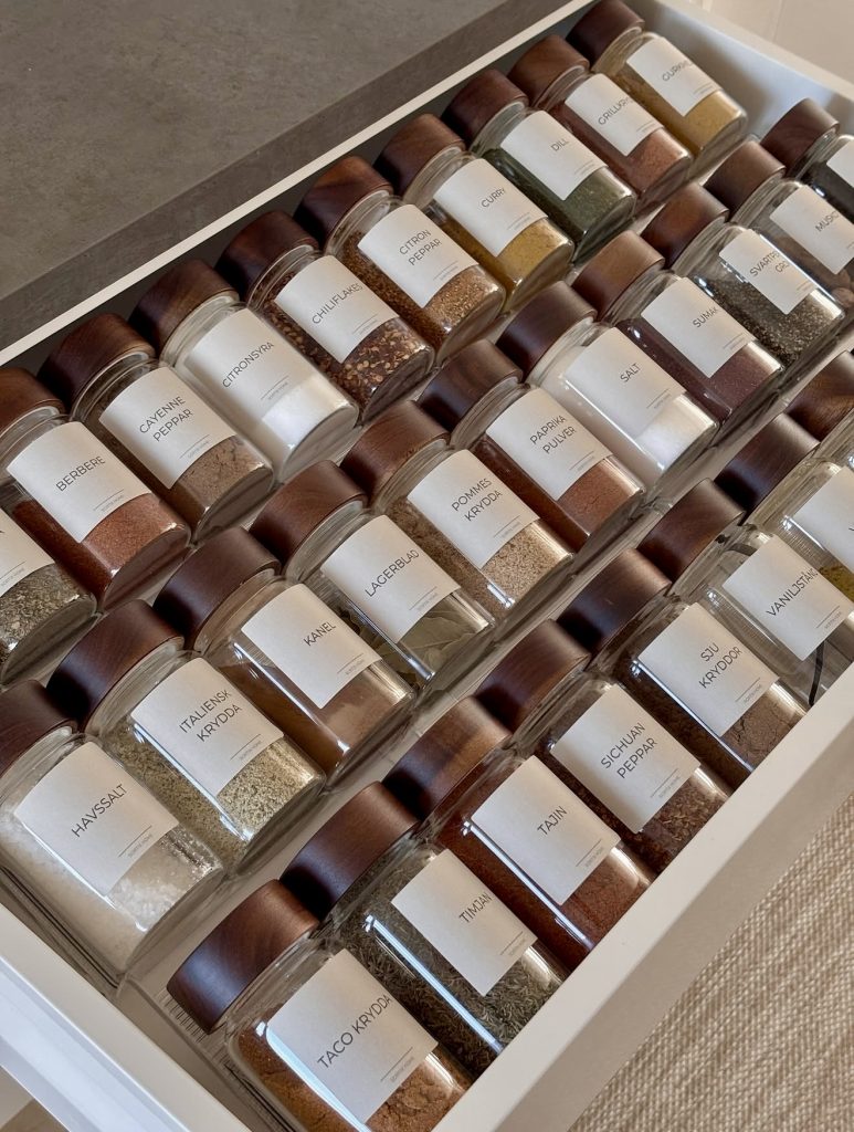 This beautifully structured spice drawer transforms everyday cooking into an aesthetic ritual. Each glass jar is neatly labeled and aligned with precision, combining elegance and function—a hallmark of modern Scandinavian organization. The uniform design, with its dark wooden lids and clear labeling, ensures every ingredient is visible at a glance. This clever setup is ideal for small spaces or tiny kitchens where vertical shelving is limited. It’s an efficient and budget-friendly DIY upgrade that rivals premium Ikea products, turning ordinary seasoning storage into a sleek design feature.