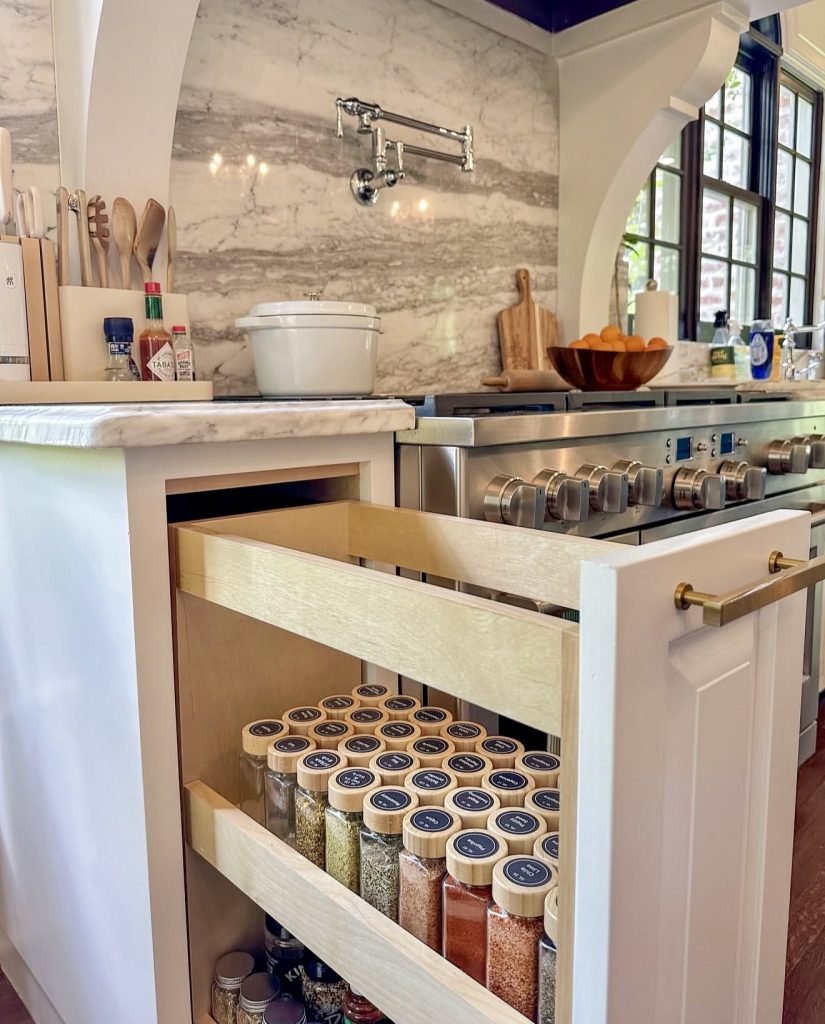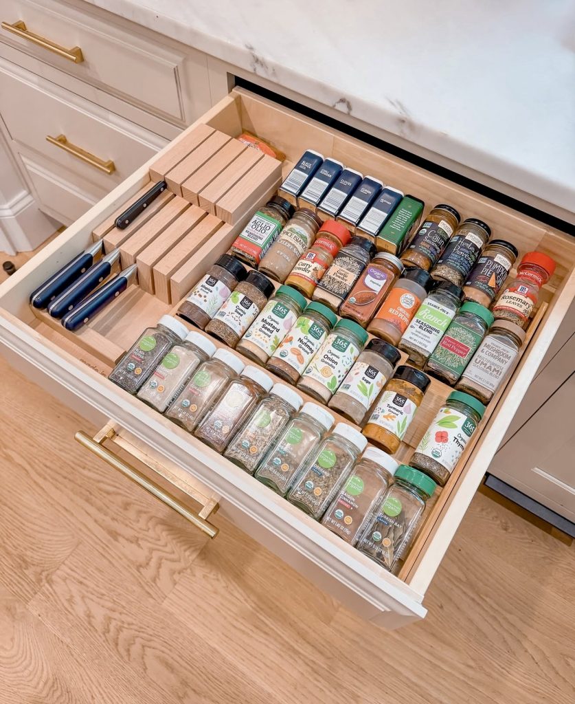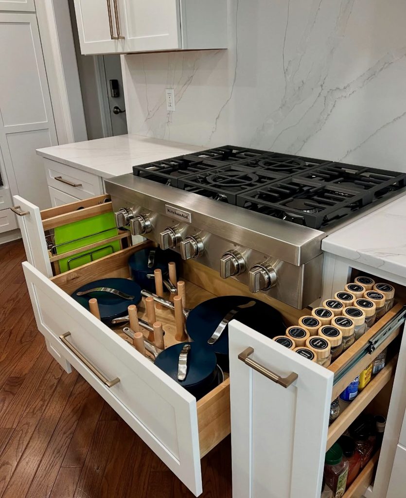 This crisp white kitchen demonstrates how a coordinated drawer system can simplify cooking for good. The deep drawers store cookware, lids, and pots and pans, while another drawer displays spices in a perfectly aligned gradient of colors and categories. It’s the kind of thoughtful design often praised by luxury kitchen brands—but surprisingly achievable for homeowners willing to lean into DIY customization. By using wooden dividers, bamboo inserts, or Ikea products, you can recreate this high-end look in a small apartment or tiny kitchen. The bright countertops, integrated knife block, and efficient, chef-friendly layout make this setup feel both polished and personal, encouraging creativity in the kitchen.