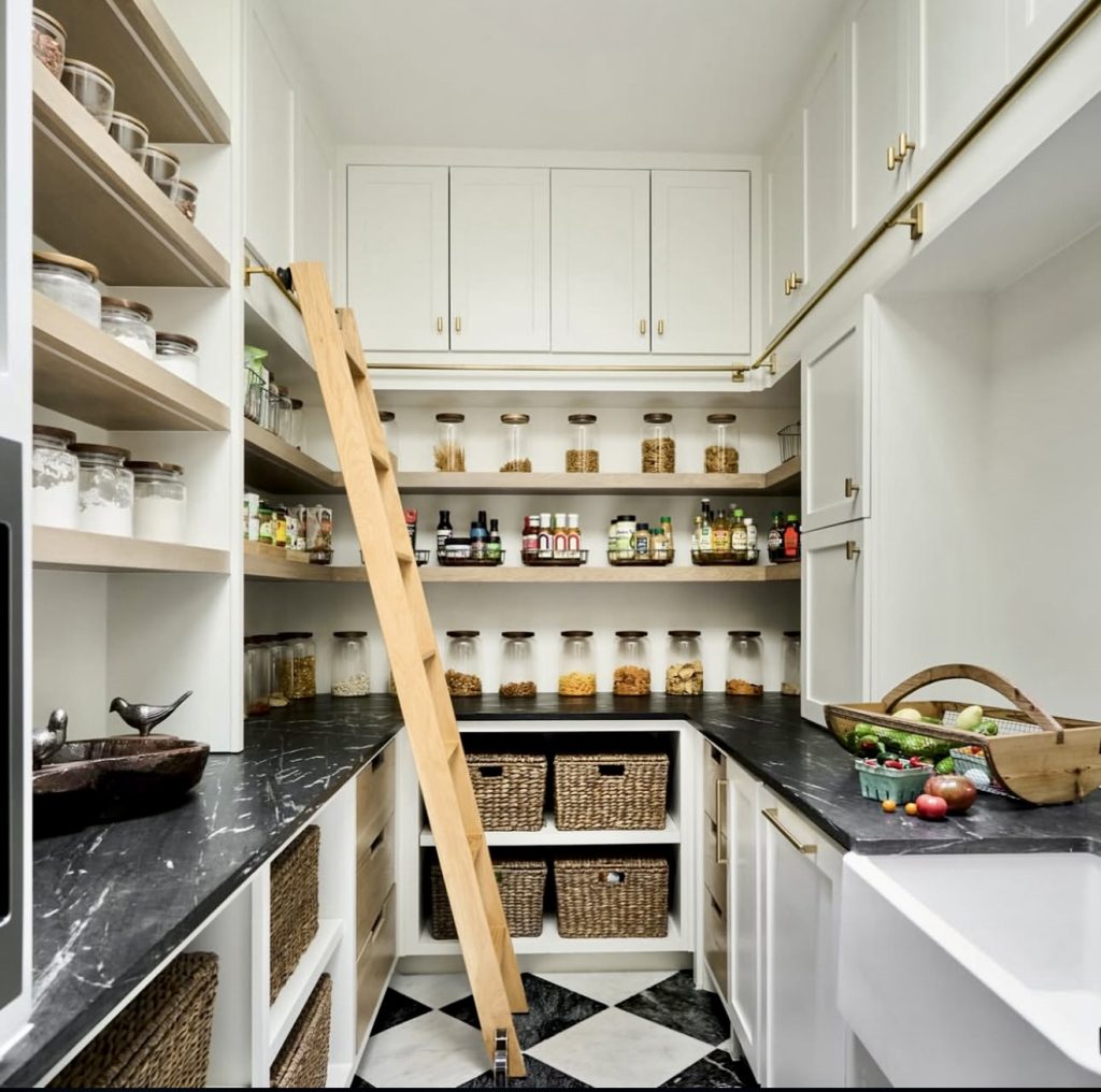 This walk-in pantry elevates kitchen storage into something truly special. With its tall upper cabinets, rolling ladder, and rows of matching glass jars, it blends luxury with everyday practicality. The black stone countertops anchor the space with a modern, slightly rustic feel that’s become popular across the U.S. in 2026. Deep woven baskets below keep snacks, baking supplies, and bulk goods tidy—perfect for families or anyone who loves to cook. What makes this space especially appealing for people living in small apartments or older homes is how replicable the layout is: a few Ikea products, some DIY shelving, and consistent containers can create the same organized mood. It’s a cozy, efficient hideaway that makes prepping meals feel like time spent in a European farmhouse.