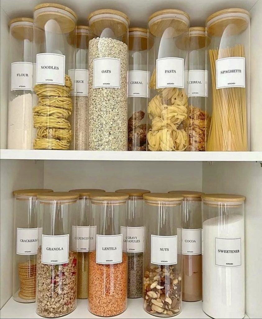 This lineup of tall storage canisters highlights one of 2026’s biggest trends: uniformity. From oats to pasta to lentils, everything is categorized, labeled, and beautifully displayed for quick access. The matching bamboo lids and minimalist labels give the collection a Scandinavian flavor—clean, calm, and functional. This system works exceptionally well in tiny kitchens or small spaces, because the vertical form of the containers makes use of height rather than depth. For budget-conscious organizers, you can easily recreate this look using affordable Ikea products, Amazon sets, or even mixing a few Dollar Tree containers for a fully cheap but polished finish.