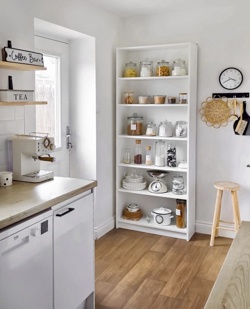 This bright, airy corner shelf shows how even the simplest setup can transform a kitchen. Perfect for small apartments, this design uses an open standalone unit to store everything from pasta jars to plates to baking staples. It’s a look that feels both rustic and modern, echoing the charm of English cottage kitchens while staying entirely practical. What I love most is that this idea is fully doable with Ikea products, thrifted shelving, or an easy DIY repaint of an old bookcase. It’s affordable, cheap to update seasonally, and ideal for renters who want stylish storage without altering the space. A setup like this also works beautifully in outdoor or semi-outdoor kitchens, giving easy access to essentials while keeping the vibe relaxed and cozy.