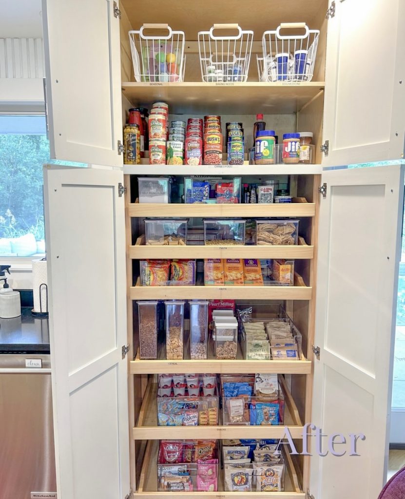 This pantry “after” transformation showcases how thoughtful organization breathes new life into existing cabinets. Pull-out shelves keep canned goods, snack pouches, baking mixes, and cereals visible and reachable—a huge upgrade for families, especially in busy households where speed matters. What makes this layout so effective is the clear zoning: baking, snacks, cereal, and meal prep all have their place. For anyone living in small spaces or older homes, this is a realistic and highly clever way to achieve a commercial-style setup without renovating the whole kitchen. Affordable bins from Dollar Tree or Ikea make the system cheap to build while still looking polished and intentionally designed.