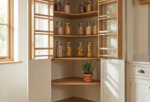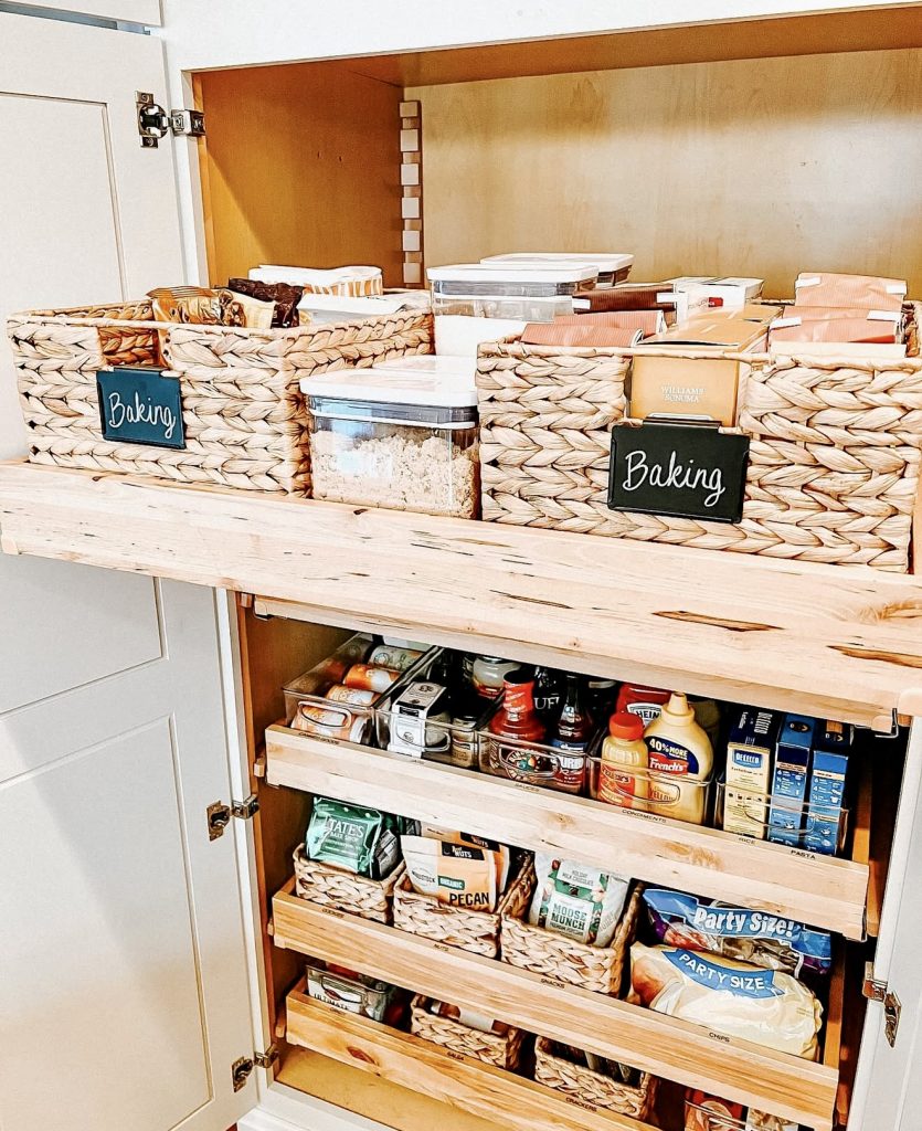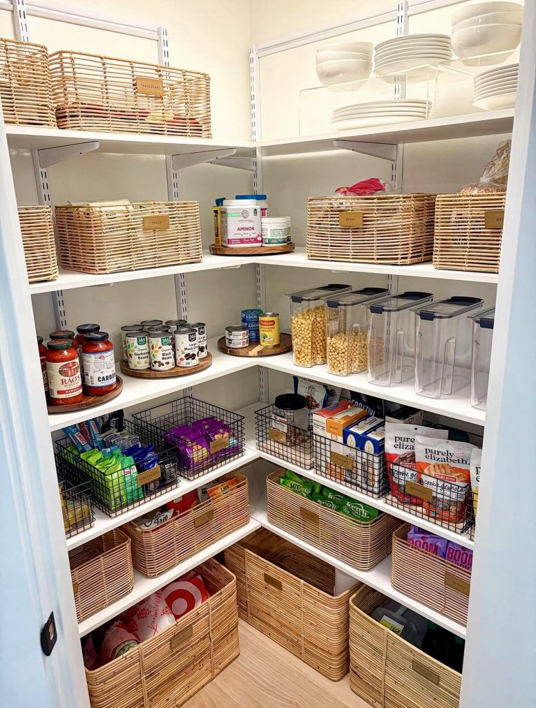 This beautifully arranged pantry shows how woven baskets can instantly elevate kitchen organization while keeping everything practical and easy to access. Each shelf is divided into clear zones—snacks, cereals, baking, and storage—making it simple to maintain order even in the busiest households. Transparent containers line the right side, showcasing grains and dry goods in a visually cohesive way that blends perfectly with the natural textures of wicker bins. Lazy Susans add rotation for jars and cans, allowing every item to be reachable without shifting things around. This design is ideal for small and medium kitchens that need functional yet aesthetic organization without major renovations.