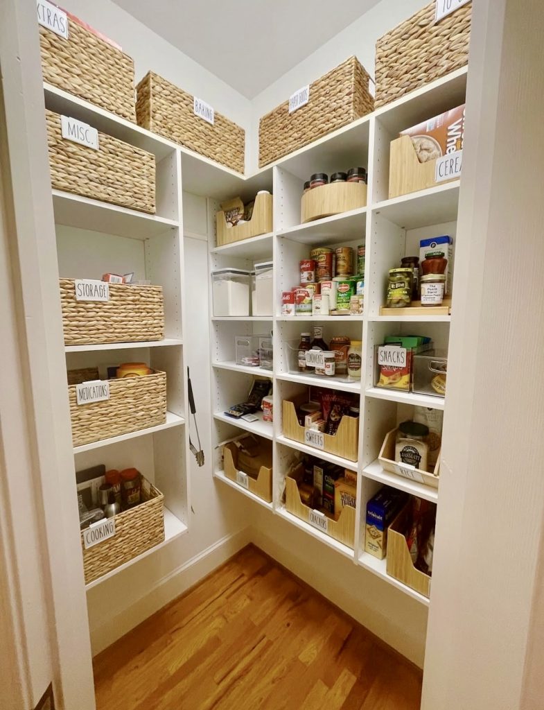 This pantry design embraces a warm, rustic aesthetic while staying highly functional. Woven baskets categorize everything from baking staples to condiments, and transparent containers help you instantly see when supplies are running low. The pull-out drawers are especially helpful for storing heavier items, making this layout great for people who cook frequently or maintain a stocked pantry. The look is clean, cohesive, and surprisingly easy to achieve with DIY updates—especially if you rely on Ikea products, Target baskets, or budget-friendly Dollar Tree bins. Because everything is grouped in intuitive zones, it’s incredibly efficient and perfect for both large homes and small apartments where organization matters more than ever.