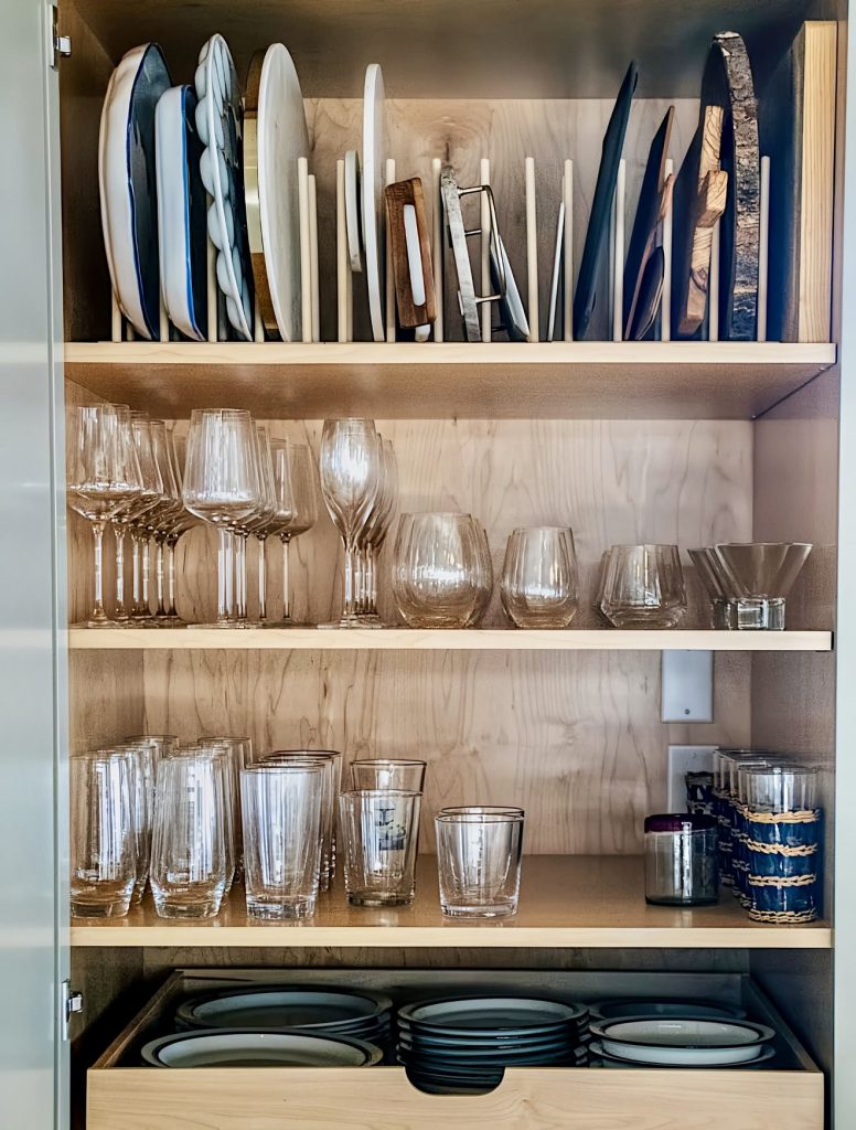 This smart shelving layout shows how well-planned cabinets can elevate both style and function. Plates stand vertically in dividers, while glasses are arranged by type—from wine to everyday tumblers—offering a clean, aesthetic balance between accessibility and order. The natural wood tones bring a rustic warmth, while the precision of arrangement feels distinctly Scandinavian. Ideal for small apartments, this design keeps your essentials close yet clutter-free. With a little DIY spirit, even cheap organizers can recreate this upscale look, making your storage feel both intentional and luxurious.
