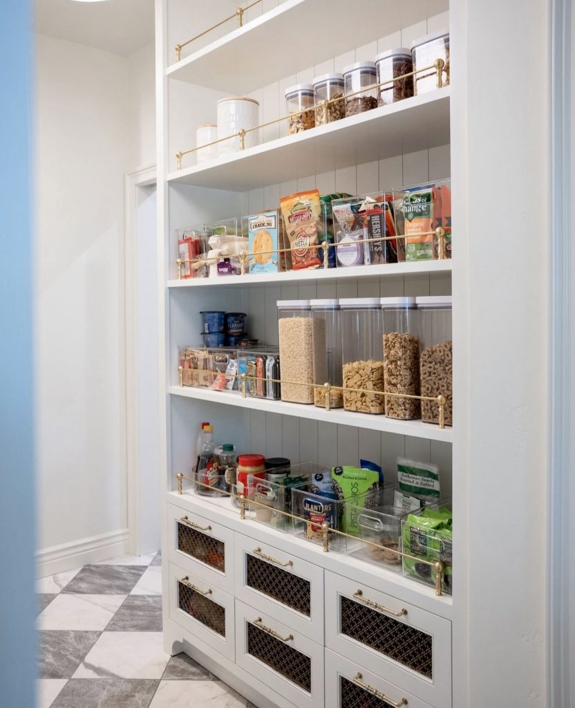 This boutique-inspired pantry feels like something you’d spot in a luxury home tour. Brass gallery rails keep items secure, while crystal-clear bins and tall canisters create a visually stunning display of grains, cereals, and snacks. Below, deep drawers with mesh fronts add ventilation—a thoughtful touch inspired by modern commercial kitchens. The marble-tile floor and bright shelving emphasize a crisp, Scandinavian-leaning design that pairs beautifully with traditional homes and contemporary spaces alike. Despite the upscale feel, the look is surprisingly achievable with smart DIY choices and budget-conscious swaps, especially using modular organizer systems from Ikea. It’s a fantastic option for homeowners who want a cozy, curated atmosphere without sacrificing efficiency, particularly in small apartments where every inch counts.