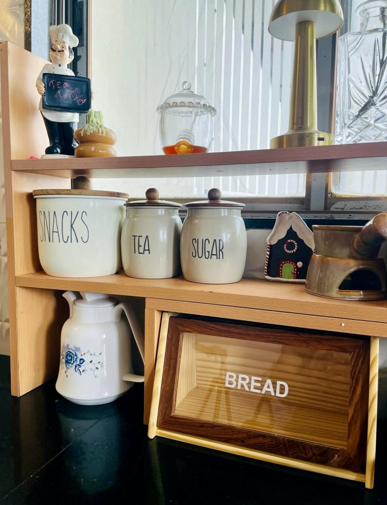 This charming countertop setup uses a tiered wooden shelf to turn everyday essentials into decor. Ceramic containers labeled “Snacks,” “Tea,” and “Sugar” create a clean, farmhouse-inspired look while keeping your most-used items accessible. The addition of whimsical figurines, a glass honey pot, and a wooden-frame bread box brings warmth and personality to the corner of the kitchen. This idea is perfect for renters or small-space kitchens—you gain vertical storage without installing new cabinets, and the arrangement doubles as both organization and décor, elevating even the simplest countertop.