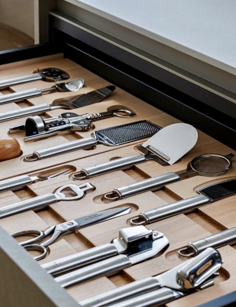 This image shows a drawer that looks like it belongs in a chef’s kitchen, with each kitchen tool having its own custom-sized pocket so everything from peelers to whisks stays perfectly aligned and easily accessible. It easily makes having a clean look while avoiding clutter so you won’t have to dig through a jumbled mess while meal prepping. This works well for modern minimalist kitchens that want to keep a clean look while also being efficient. If you’re planning a remodel or just want to upgrade the insides of your drawers, this custom design will help keep everything organized in a smart way.