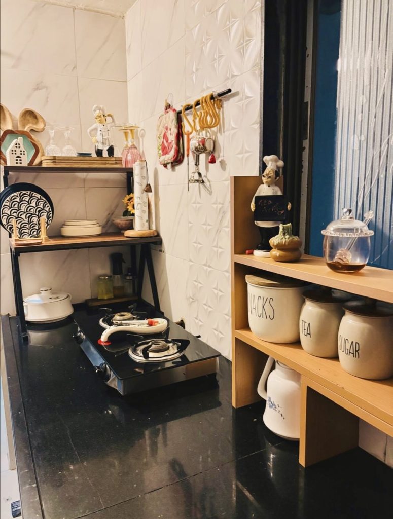 This final image showcases a beautifully styled yet highly functional countertop setup that relies on open shelves, metal hooks, and labeled ceramic canisters. The combination of wooden display shelves and hanging racks allows you to keep utensils, plates, and decor arranged in a layered way that feels curated rather than cluttered. The ceramic snacks, tea, and sugar canisters tie the look together while offering quick access to daily essentials. This layout works especially well in compact kitchens by adding vertical storage, charm, and personality without sacrificing workspace.