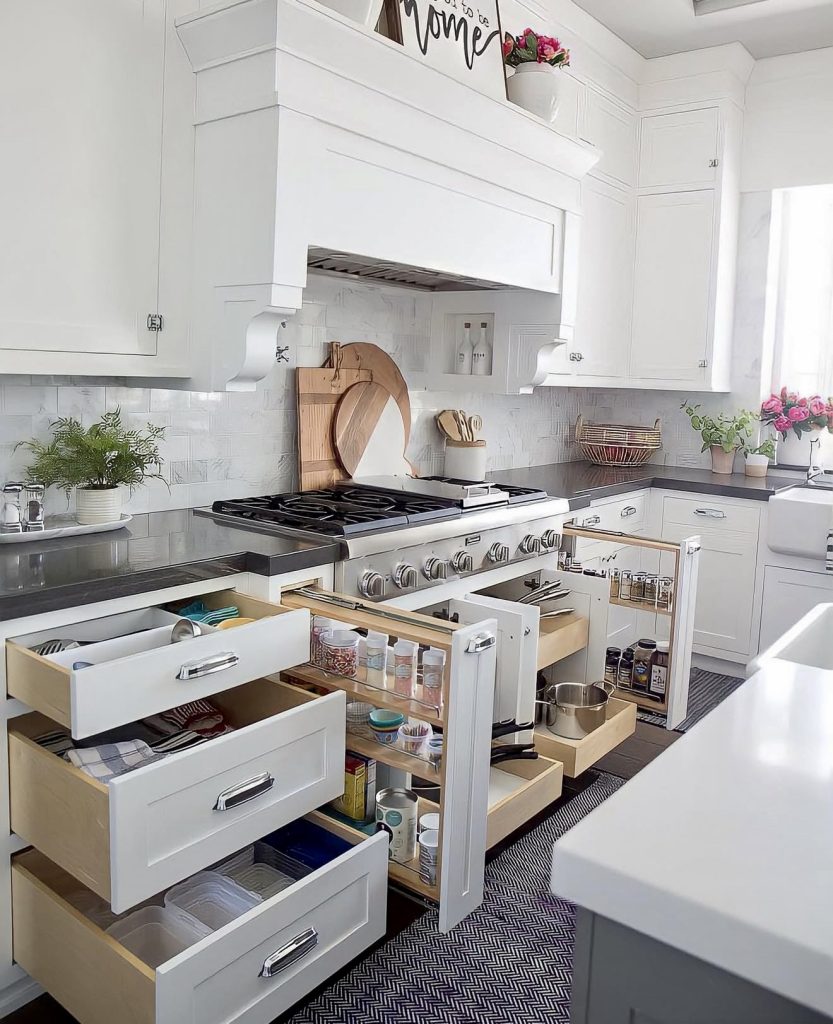 This bright white kitchen demonstrates how organization can feel both rustic and modern. Multiple pull-out sections, from deep drawers for pots and pans to narrow racks for cleaning supplies, create a visually stunning yet highly efficient system. The under-sink compartments maximize space without sacrificing design harmony. This kind of storage innovation—often seen in Ikea products—is perfect for tiny kitchens or small spaces. The uniform cabinetry and polished countertops maintain a cohesive aesthetic, while the DIY adaptability means anyone can replicate it on a budget using cheap local solutions or Dollar Tree bins.