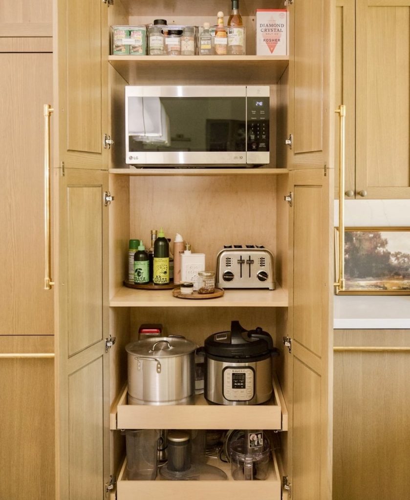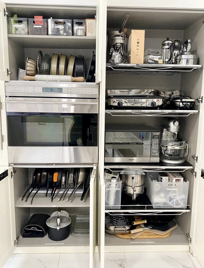 This tall dual-door cabinet looks like something you’d see in a professional commercial kitchen—but it works perfectly in suburban homes, too. Every shelf is strategically divided: baking pans on the left, mixers and specialty gadgets on the right, and pots and pans efficiently stored below. Wire pull-out trays make it easy to reach heavy equipment without bending or digging, making this a lifesaver for anyone designing a kitchen that grows with them. If you’ve been following kitchen experts like Studio McGee or Chris Loves Julia, you’ll recognize the emphasis on simple, modular zones that help maintain order even in small apartments. It’s a stunning mix of beauty, practicality, and thoughtful planning.