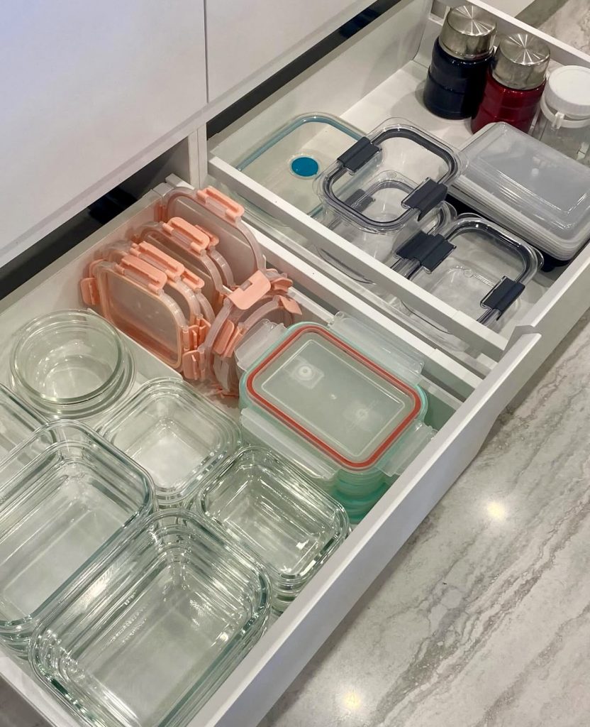 Anyone who meal-preps knows the struggle: lids everywhere, containers mismatched, nothing stacking correctly. This beautifully organized drawer solves all of that with dedicated dividers for lids, plus a grid-style layout for glass containers. The result is a calming, aesthetic setup that’s practical for families, busy professionals, and students living in tiny or small spaces. What I love is how achievable it is—you can recreate this look using Ikea products, Amazon dividers, or even Dollar Tree bins for a cheaper, budget-friendly option. This is also a great add-on for anyone building a modular pantry system because it keeps meal storage essentials streamlined and ready for the week ahead.