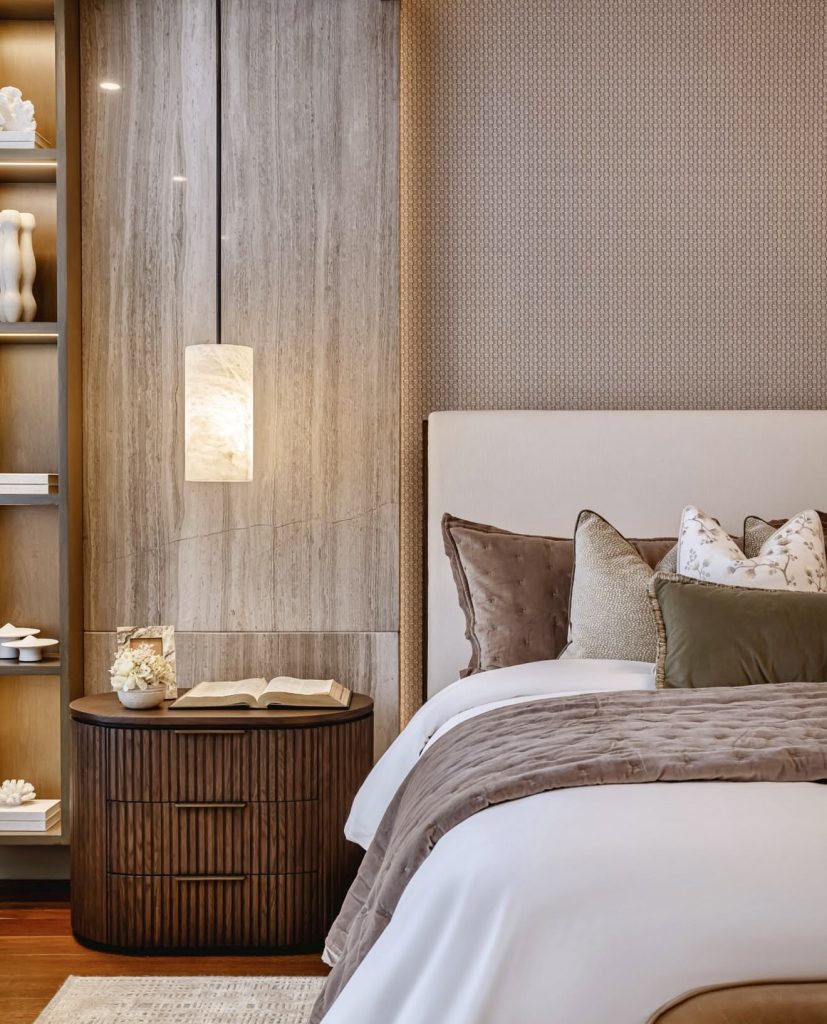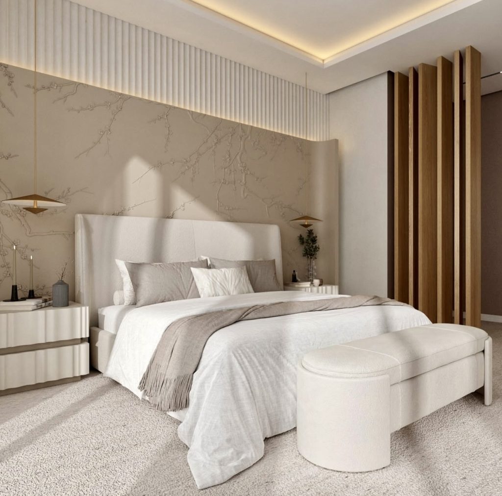 This master bedroom is the epitome of modern luxury decor in 2026. That’s because it combines the perfect blend of sculptural lighting fixtures, fluted wall detail work, and the perfect tone. Additionally, the dead-on etched wall design detail brings the perfect combination of artistic sensibilities. However, the warm wood accents bring the perfect combination of natural elements for the room’s sleek minimalistic theme. Additionally, the nightstands are free from unnecessary detail work. Also, the textured bedding brings the perfect level of grounding to ensure that the room never feels too cold. This brings the perfect combination of decor ideas for people seeking the perfect blend of the refined decor ideas for the luxury decor theme.