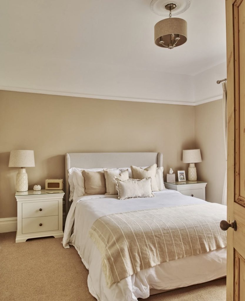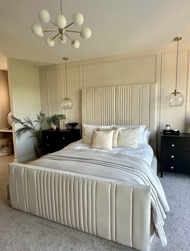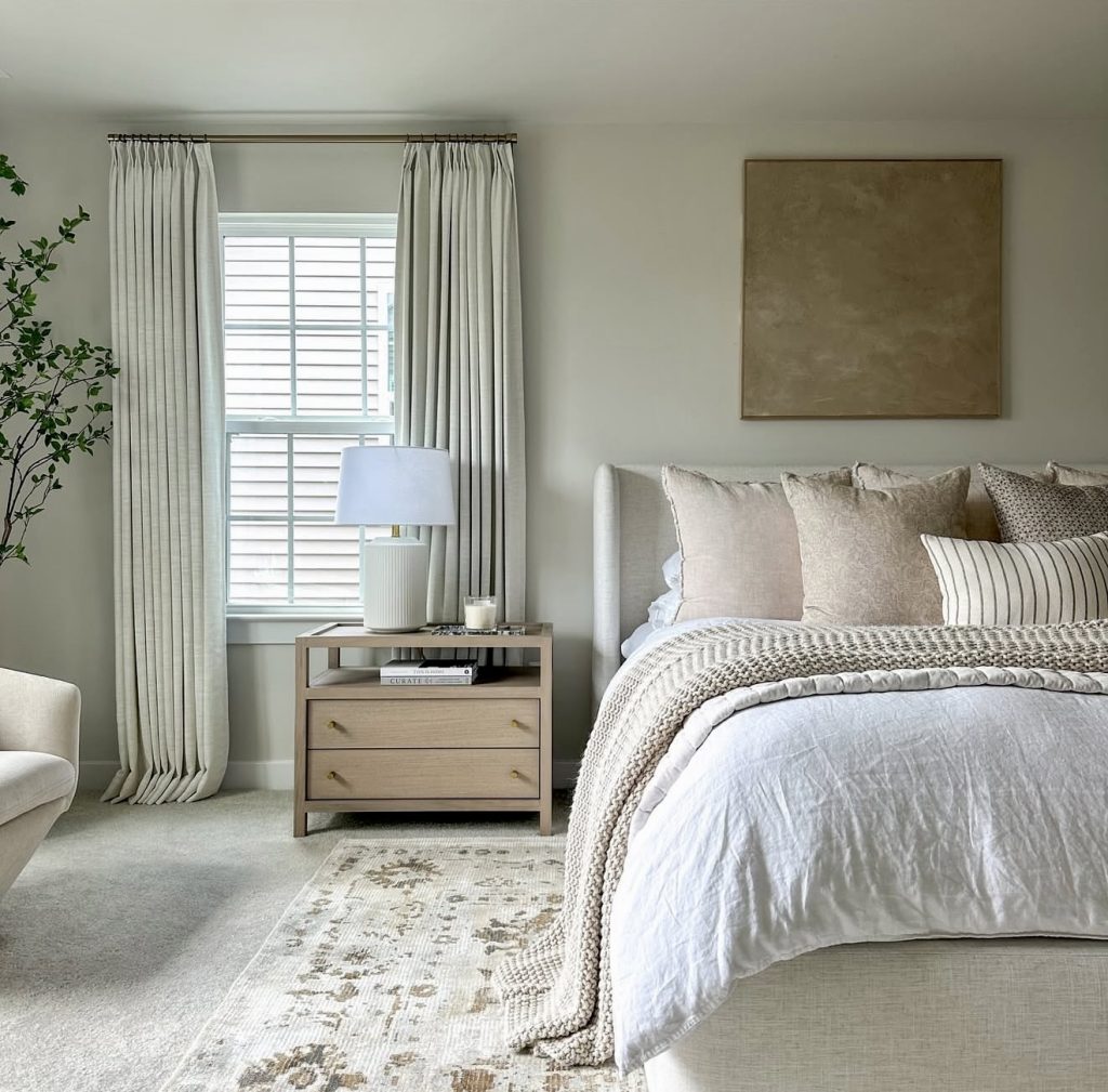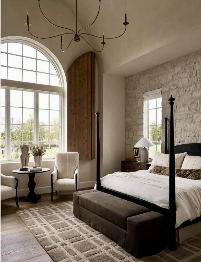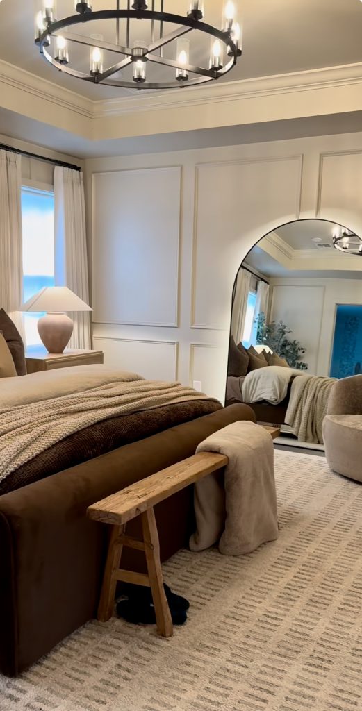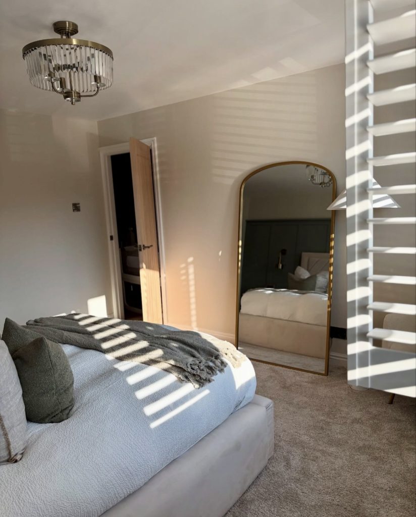 This beautifully designed room captures the beauty of natural lighting by allowing the striped shadows to dance in the room in such a way that feels very much alive and personal—a detailing in decor that many designers say is the ultimate free source of decor ideas. This floor-length mirror adds elegance to the room through its modern glam while contrasting subtly with its surroundings of textured bedding and inviting pillows. Adding a soft throw on the bed reinforces the comfortable atmosphere aligned perfectly with 2026’s decor love for approachable luxury. This room brings the perfect harmony between simplicity and personality in master bedrooms by proving that modern luxury decor doesn’t require loud statements because sometimes the beauty in modern decor lies in the subtle combination of natural lighting, soft lines, and carefully selected decor.