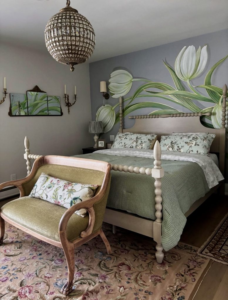 This bedroom captures the playful traditionalism that comes from the combination of botanical wall murals, spindle-framed furniture, and highly patterned textiles. This room captures the perfect blend of bold creative expression in the form of the statement-sized floral art piece. At the same time, the multi-layered bedding configuration and the antique rug work together in the perfect way to bring both the warm familiarity of the traditional theme together along with the perfect blend of freshness. Additionally, the carvings on the seating bench work in conjunction to bring the perfect blend of the craft-made theme throughout the room.