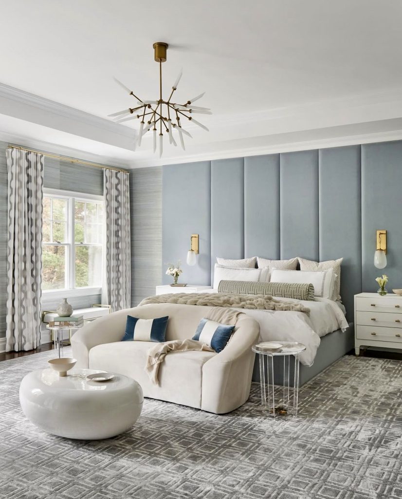 This master bedroom captures the perfect combination of color usage in terms of the 2026 decor theme. That’s because it uses the perfect combination of the soft blue upholstered wall in the perfect way. However, the room combines the perfect combination of plush textiles in terms of the bedding configuration. At the same time, the master bedroom area combines the perfect combination of sculptural furniture. Additionally, the room is finished off by the perfect combination of metal lighting fixtures in the perfect blend of the room’s soft color usage. Additionally, the room’s small seating area captures the perfect combination of the decor’s modern theme and the multi-function master bedroom areas.