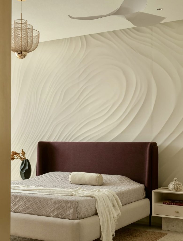 This master bedroom beautifully adopts artistic minimalism through the dramatic décor of the textured wall behind the headboard. This gives the room the elements of modern luxury decor. However, the deep burgundy headboard balances the room’s décor without overpowering the soft atmosphere. Modern designers are now utilizing textured walls for the adequate decoration of homes through the subtle presentation of their textured looks. Thus, the room now serves as the perfect bedroom through its inspiring artistic décor.