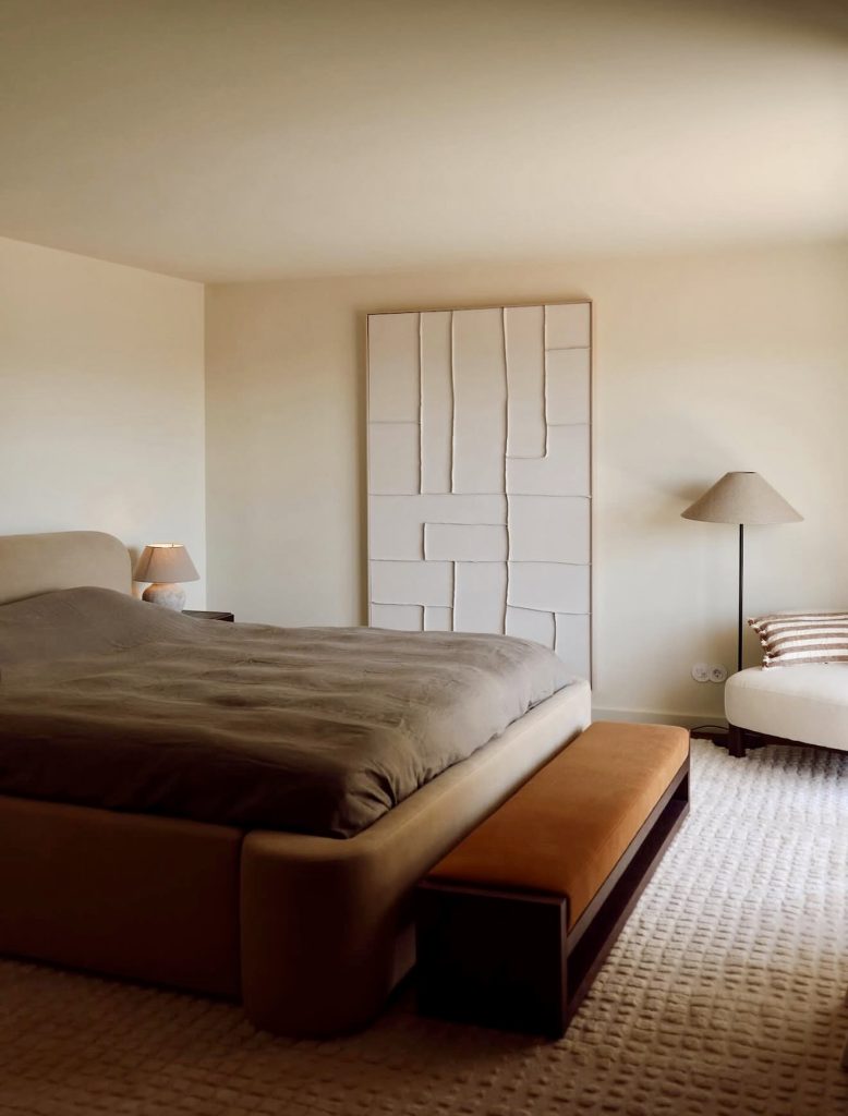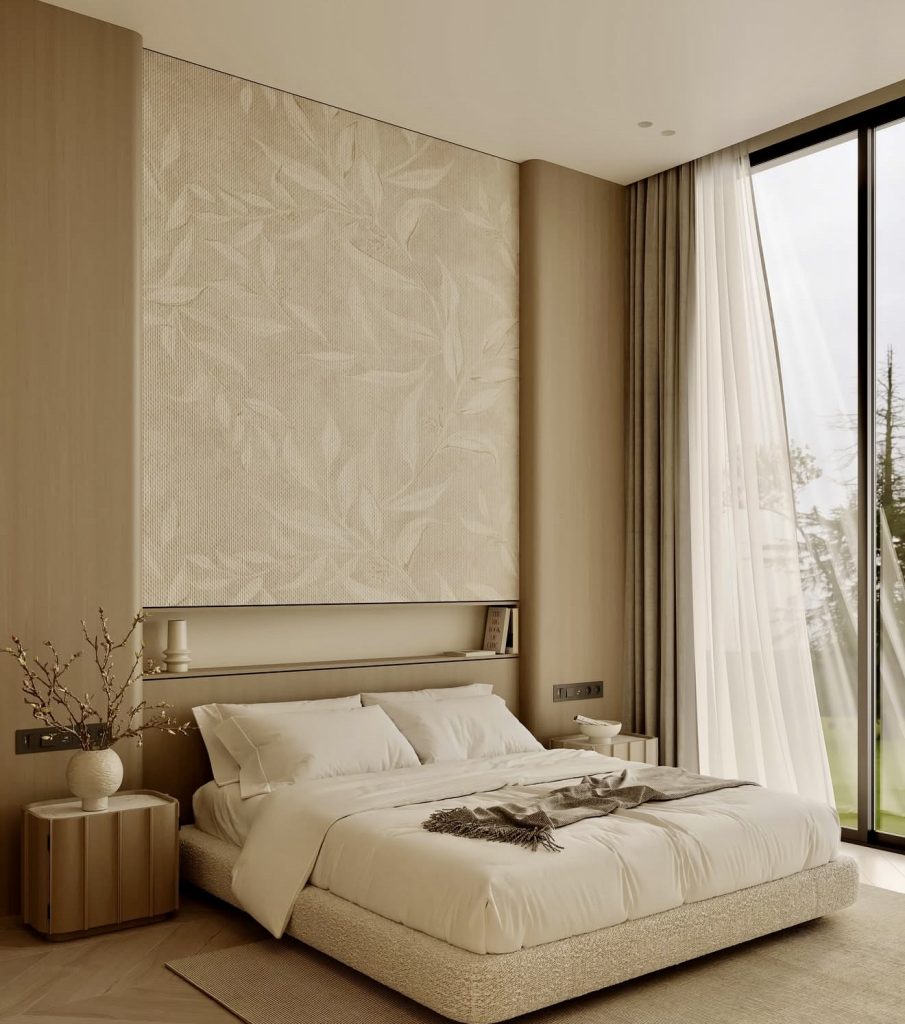 This master bedroom brings the best decor in terms of the soft natural color. Adding the perfect architectural theme in terms of the branch brings elegance. Elegance can be achieved by adding the ideal linen bedding and furniture. Elegance is added by using the ideal furniture, such as knit throws. Elegance is added when the ideal furniture is used for the pillow. It is the perfect example of how master bedrooms can radiate serenity and sophistication through the use of soft lines, natural lighting, and carefully selected textures—the perfect marriage of functionality and decor modernism.