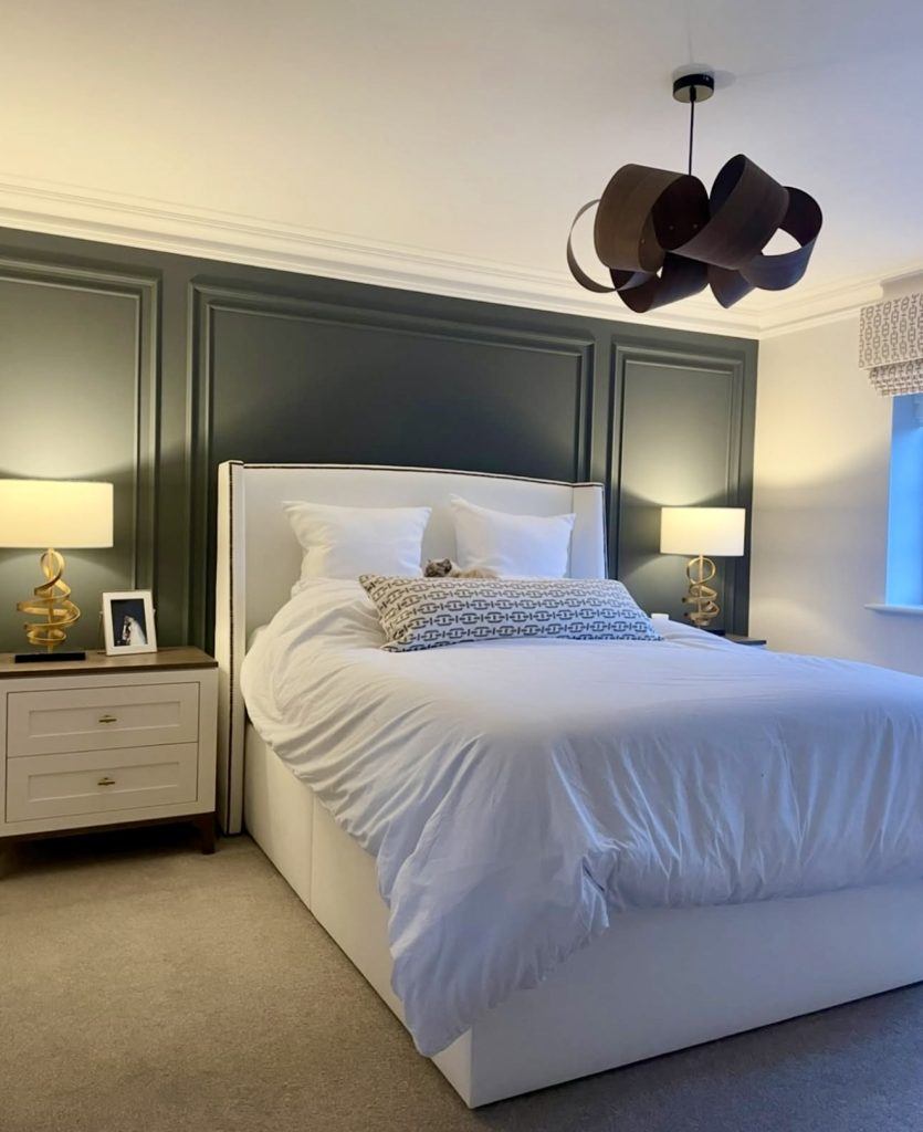 This bedroom leans into confident contrast, pairing deep green paneled walls with clean white bedding to create a visually striking yet harmonious retreat. The sculptural ceiling light becomes an instant conversation piece, offering the kind of elevated detail often seen in designer-curated master bedrooms. Warm brass lamps add balance and glow, bringing in a touch of romantic softness to counter the bold wall color. The overall look blends personality with polish—proof that even a single accent wall can dramatically shape a space when used with intention and style.