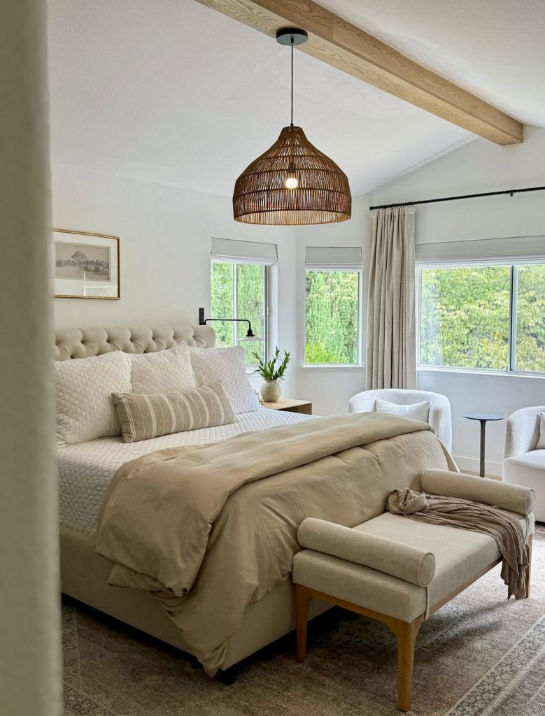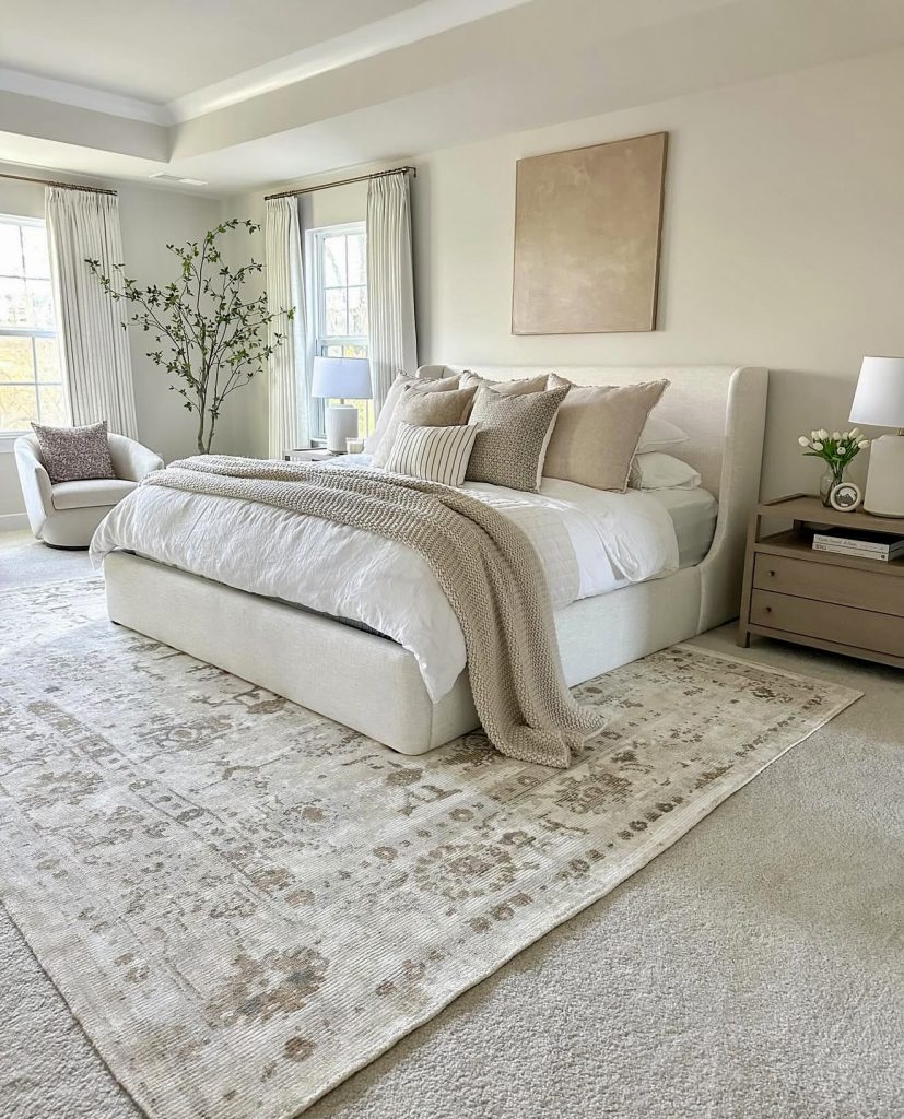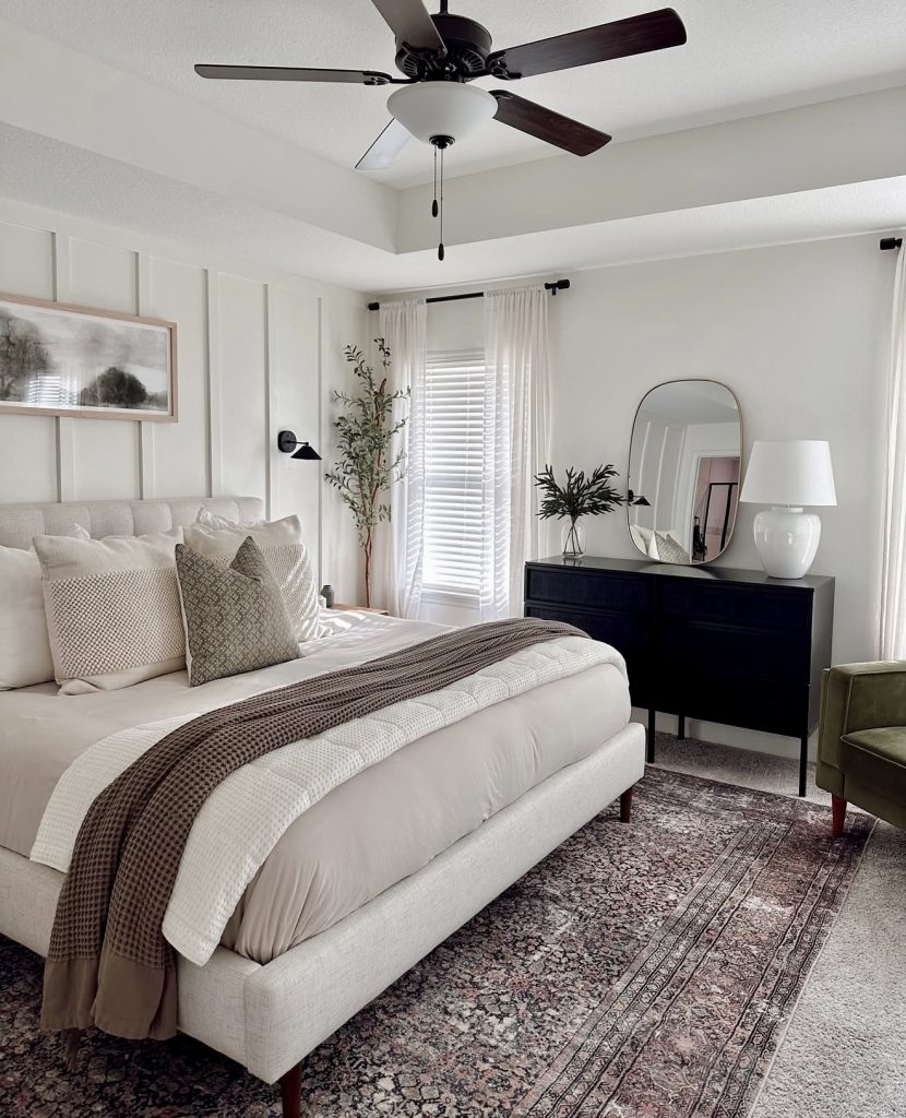 This master bedroom blends modern classic elements with richly layered textiles, resulting in a deeply inviting space that embodies cozy, relaxing decor while maintaining a sense of refinement. The patterned rug, structured bedding, and combination of wood and black furniture add dimension without disrupting the room’s soft, airy flow. Subtle greenery and sculptural accessories provide organic balance, a trend consistently praised on designer platforms for its ability to bring life into neutral spaces. It’s an excellent example of how decor ideas can fuse comfort with style, creating a master suite that feels warm, current, and effortlessly livable.