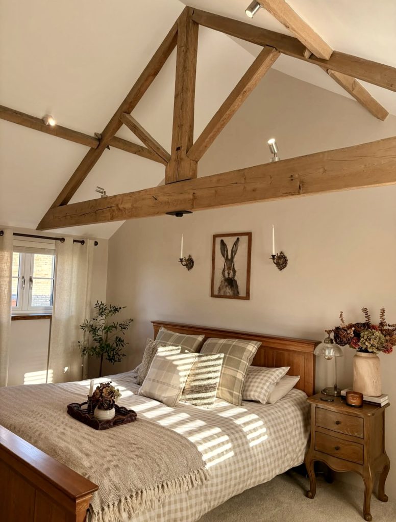 This bedroom celebrates rustic coziness with exposed beams that instantly set a warm, character-rich tone—an architectural detail many designers praise for adding depth and authenticity to master bedrooms. The checked bedding, soft throws, and earthy palette make the room feel grounded and lived-in, echoing the rise of American countryside-inspired decor and cozy relaxing trends for 2026. Subtle touches, like dried florals and a vintage-style nightstand, add layers of personality without crowding the space. The sunlight filtering across the bed ties everything together, giving the room a natural warmth that feels both comforting and timeless.