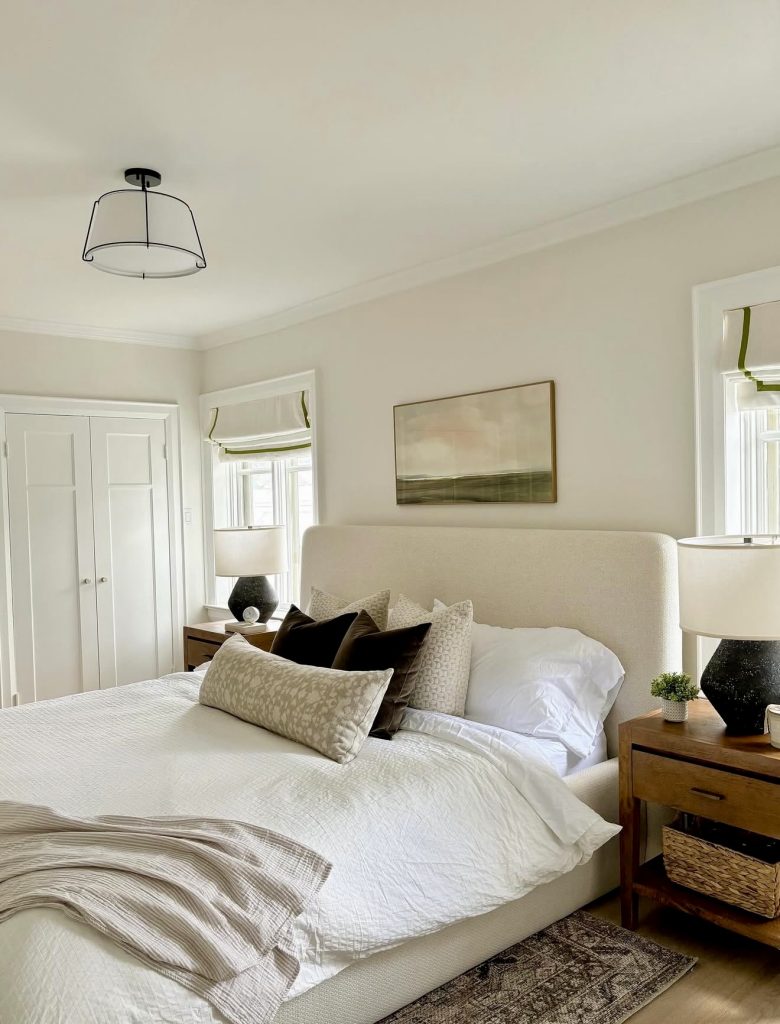 This design showcases the quiet strength of tailored minimalism, where clean lines and well-curated textures create a serene haven aligned with modern decor ideas. The upholstered bed offers structure without heaviness, while the mix of crisp whites and rich earth-toned pillows adds visual depth. Subtle artwork and natural wood nightstands introduce just enough character, reflecting a popular 2026 approach: thoughtful restraint. With its soft lighting and uncomplicated styling, this space embodies modern decor principles while remaining warm and approachable for everyday living.