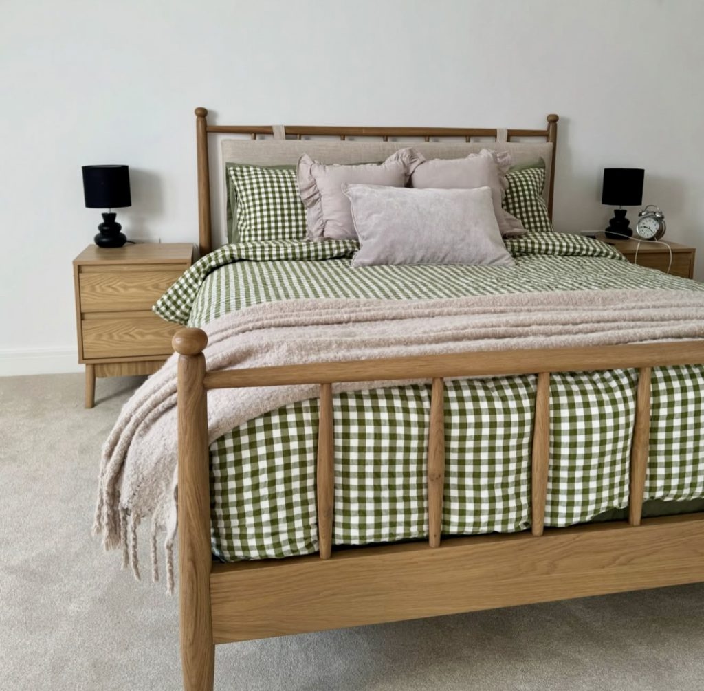 This bright bedroom combines the decor fix of the year 2026 by incorporating the focal point of green gingham bedding. Nothing says cottage like the natural wood furniture in the room. However, to play off the natural theme of the furniture, the nightstands are made of the same wood. To soften the bold pattern of the decor, blush-colored throw pillows bring the pattern together. Black table lamps bring the decor’s modern aspect to the room. This room embodies how decor ideas come together by incorporating the theme of Americana decor motifs in the year 2026 through its mix of decor shapes in order to make the room inspiring, personal, and very much lovable.