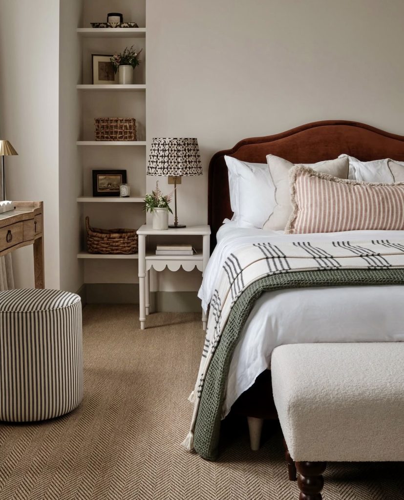 This bedroom carries the beautiful mix of textures in the room by blending the soft stripes, natural wood-tone decor, and the warm decor textiles. This room embodies the theme of decor romanticism through its elevated decor comforts in order to make 2026 decor ideas lovable. Adding the decorative nightstand that carries the theme of the scalloped tabletop decor element carries the theme of decor playfulness. Adding the decorative lamp in the room carries the theme of decor playfulness in order to make the room very much lovable. This room captures the theme of decor ideas, mixing the slight pattern in the room through its neutral-colored decor in order to make the room very much lovable.