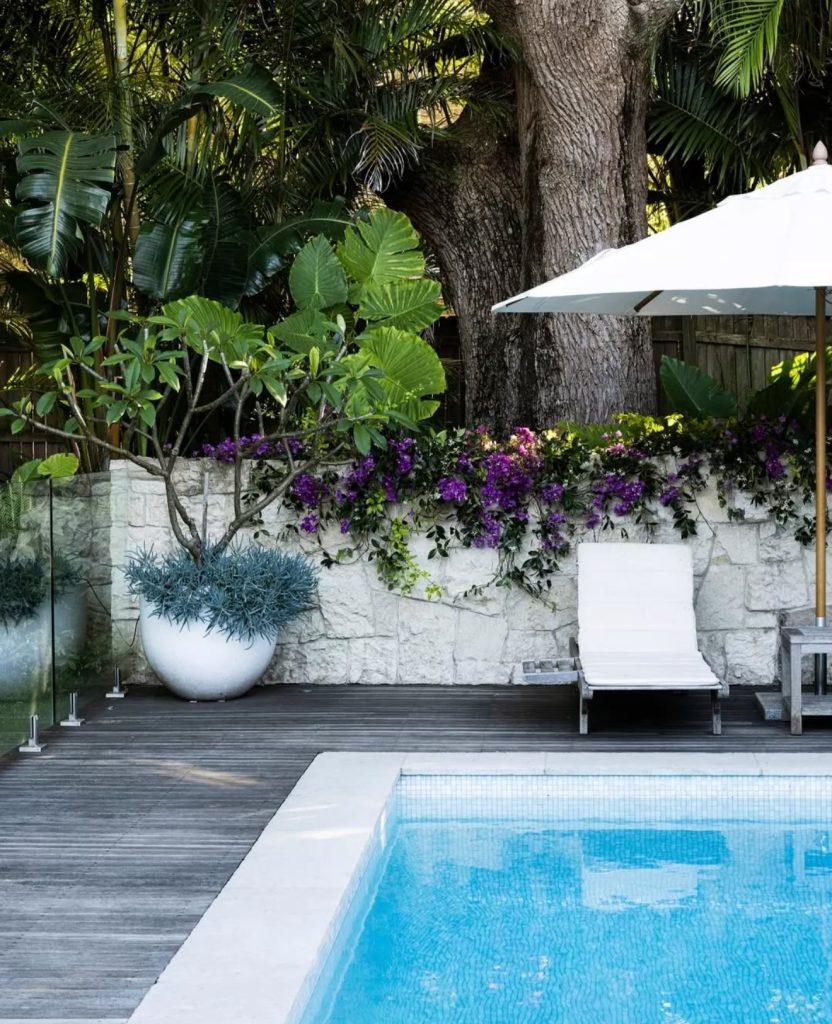 This lush setting layers oversized foliage with cascading purple blooms, creating a deeply tropical backdrop that softens the clean lines of the stone wall and the minimalist deck. The combination of sculptural plants like elephant ears, palms, and a potted blue-toned shrub shows how thoughtful design can bring instant personality around an inground or plunge pool. It’s the kind of environment homeowners often dream about when flipping through modern backyard ideas, proving that color, texture, and greenery can transform even a compact space into a small botanical retreat.