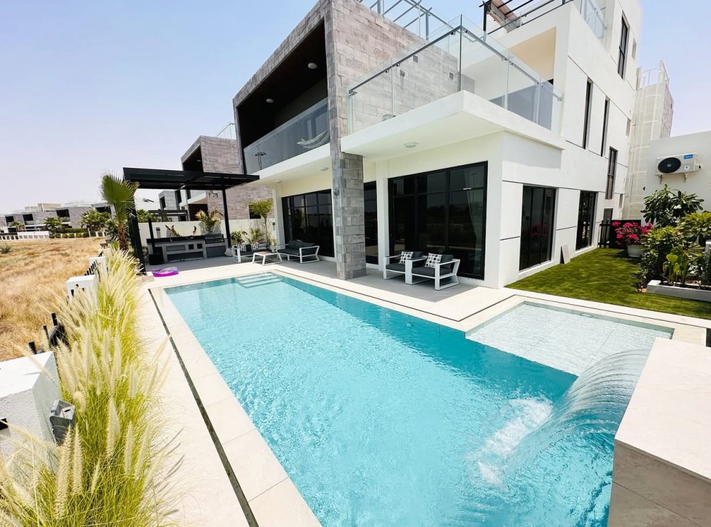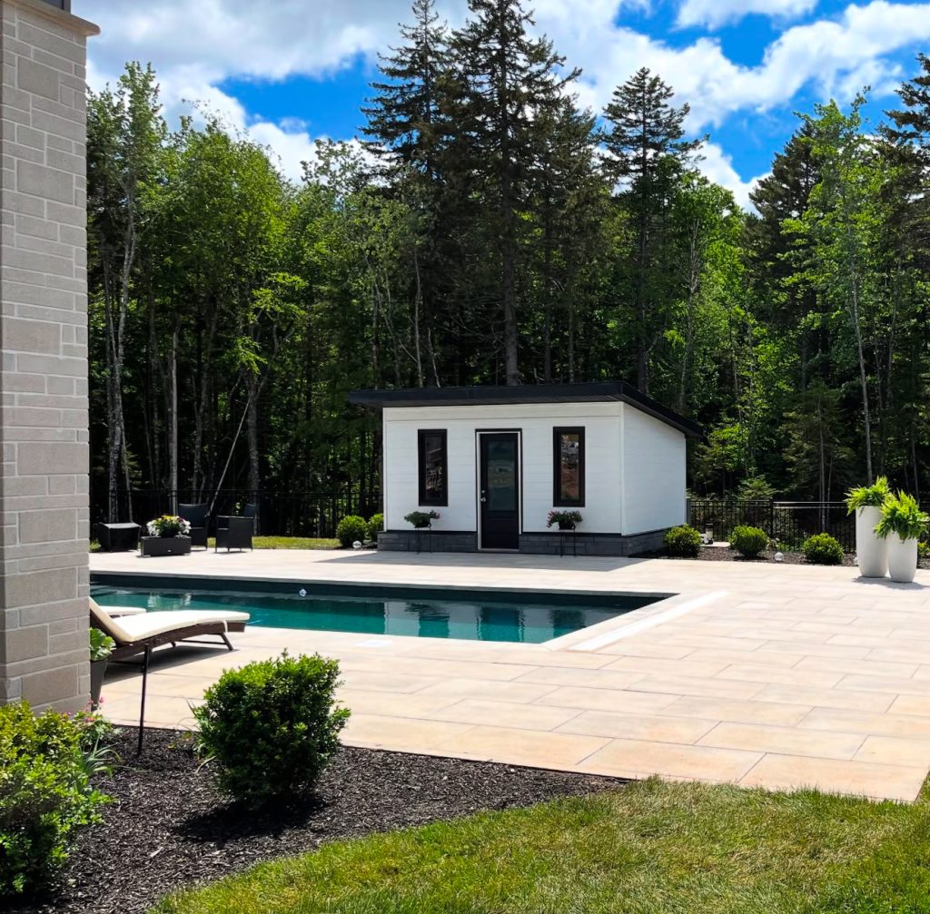This expansive layout captures the essence of a private resort, pairing a sleek geometric pool with long strips of green turf that create striking visual rhythm across the yard. The crisp white paving enhances the brightness of the space, making the water pop while keeping the overall design inviting and clean. For homeowners exploring above-ground design or backyard above-ground upgrades, this is a reminder that linear patterns and thoughtful plant placement can make even large spaces feel cohesive and functional. Quiet rows of young plants along the fence tie the entire setting together, ensuring the modern look doesn’t feel overly stark.