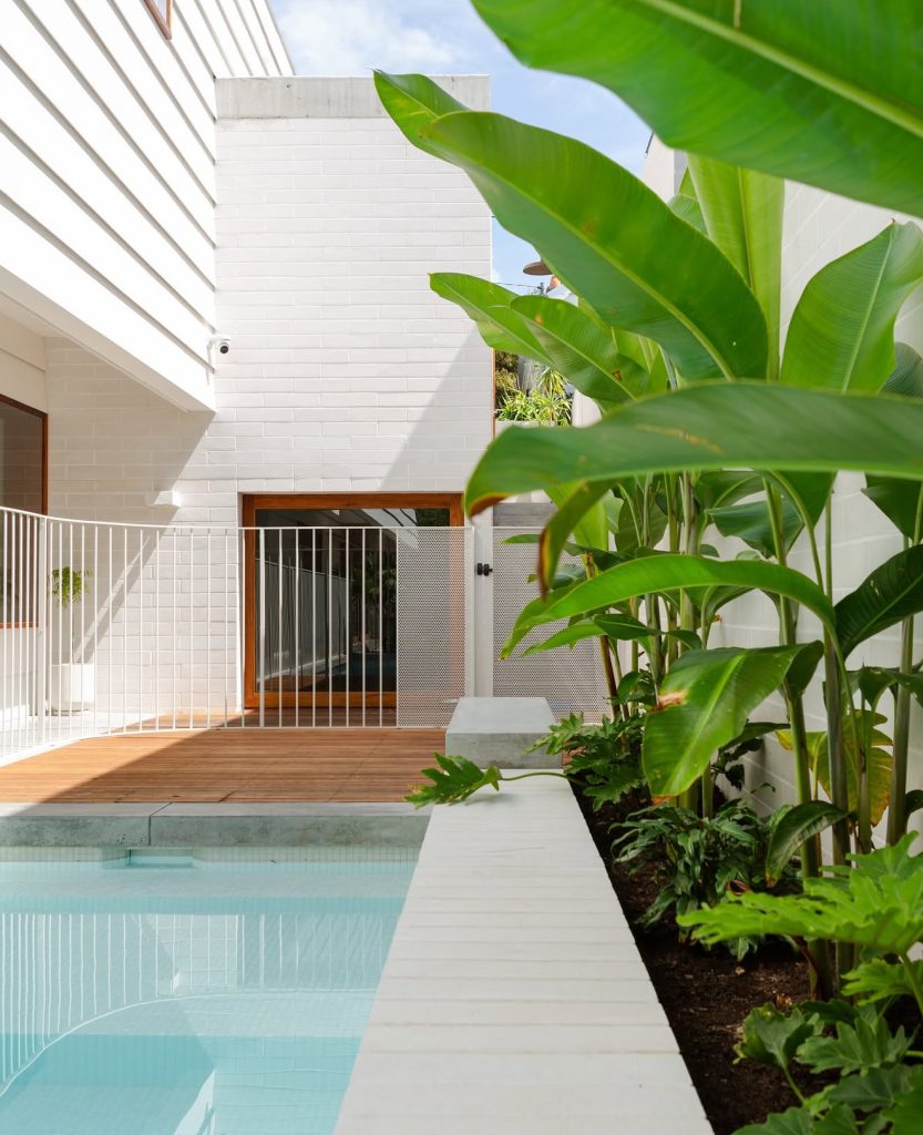 This smartly planned layout transforms a tight side yard into a refreshing tropical escape, using tall leafy plants to create privacy while adding movement and color. The pale tile border and warm wood deck make the slender swimming space feel brighter and more open, demonstrating how creative design can turn even unconventional footprints into standout features. It’s an inspiring example for anyone looking for ideas to upgrade small backyard corridors or create intimate lounging zones next to a compact plunge pool.
