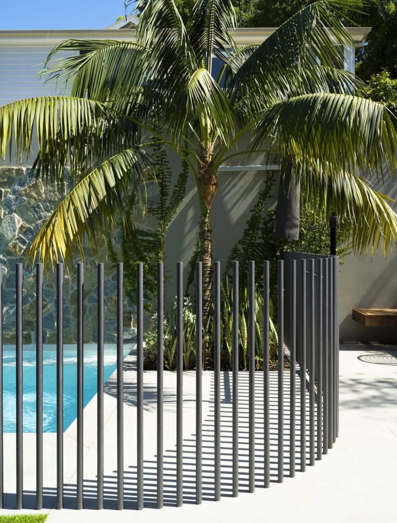 This stylish setting centers around a single statement palm, framed by a curved metal fence that casts dramatic shadows and acts as a sculptural feature. The clean geometric paving and mix of vertical greenery reinforce a modern, airy aesthetic that feels especially on-trend for 2026. For homeowners exploring backyard ideas that blend minimalism with natural impact, this approach shows how one well-placed tree and thoughtful vertical lines can elevate an inground layout without overwhelming the space.