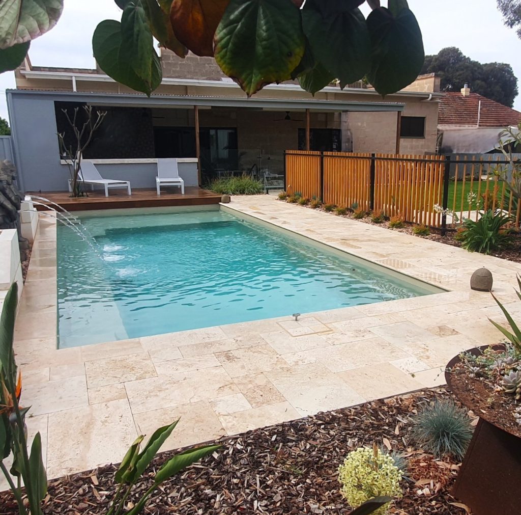 This inviting backyard design pairs travertine paving with soft-hued plant beds, creating a warm atmosphere that leans into gentle desert tones without losing its suburban charm. The wooden fencing and raised deck introduce texture and height variation, while the simple water features add soothing movement. It’s a strong option for homeowners wanting simple design ideas for an inground setup that feels grounded, welcoming, and easy to maintain, especially when working on a budget but still craving a resort-like touch.