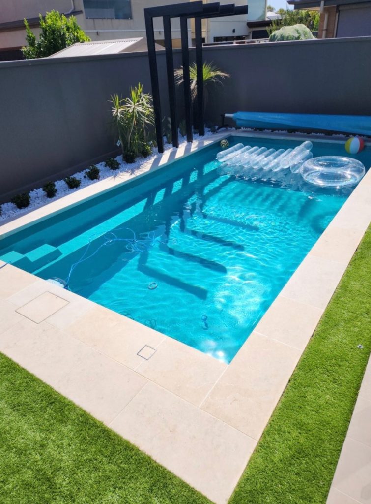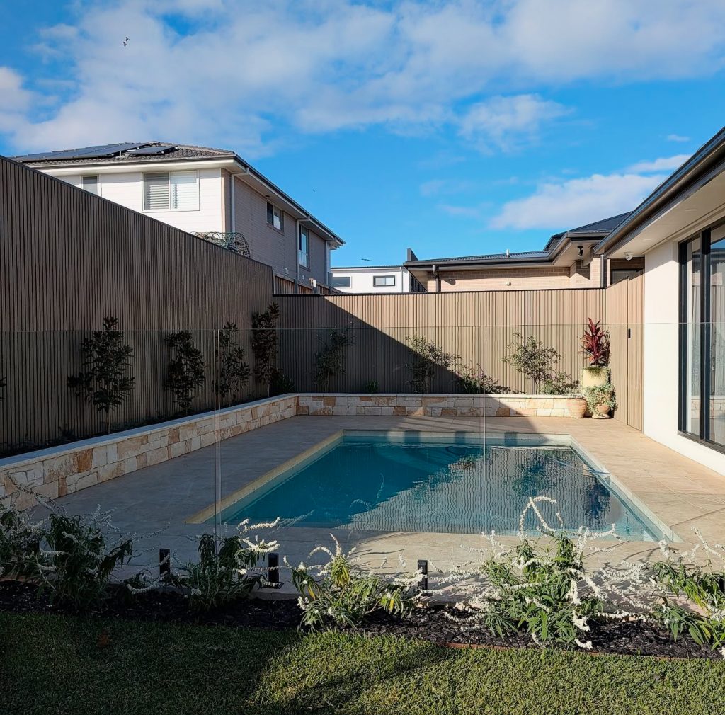 A calm and structured layout defines this inground pool, where a low brick border and polished paving create a clean architectural frame that feels perfect for a backyard with modern lines. The transparent fence keeps the flow open around the water while maintaining safety without disrupting the view. A simple row of evergreen plants provides privacy and softness, proving you don’t need complicated arrangements to achieve thoughtful design. This style works exceptionally well for homeowners looking for ideas to refresh a small backyard without overwhelming the space.