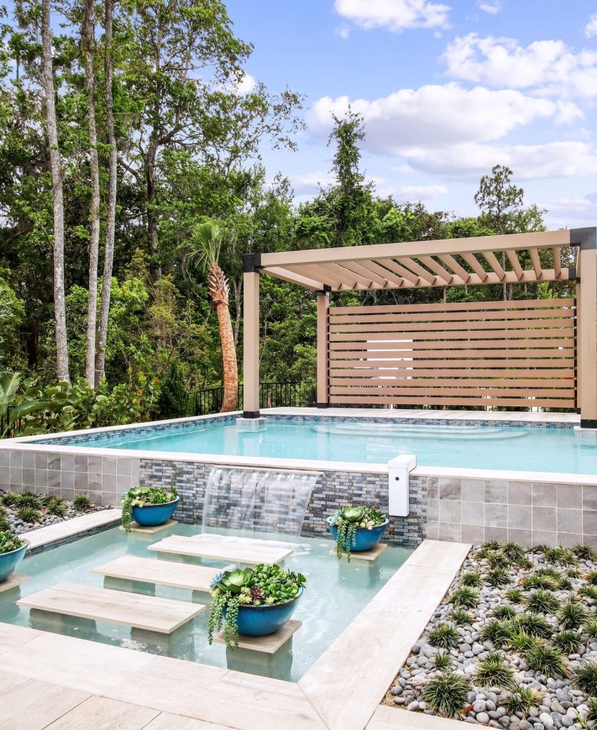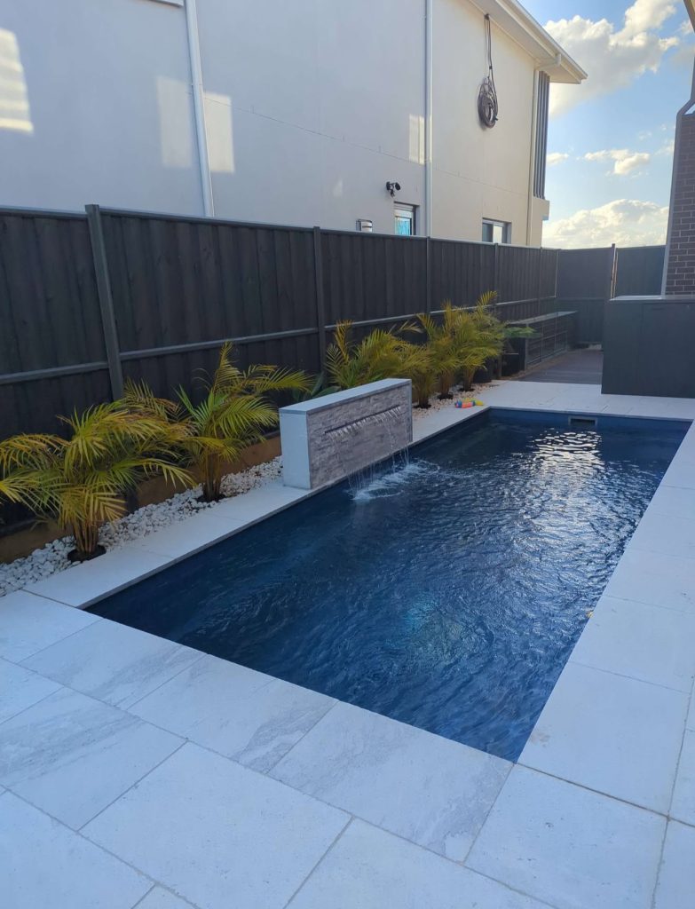 This sleek, dark-lined inground pool pairs modern symmetry with a soft row of palms and bright white stone, creating a clean and calming escape ideal for suburban homes. The small water feature adds movement without overwhelming the narrow layout, making it especially appealing for homeowners seeking simple backyard ideas that are easy to maintain. Subtle tropical accents along the edge give the space a laid-back energy, showing how even minimal greenery can elevate a crisp architectural environment.