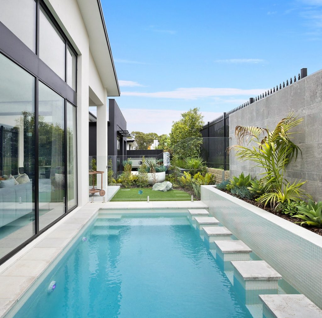 This contemporary lap-style swimming pool uses a slender footprint to its advantage, connecting the water directly to a vibrant mixed garden beyond the glass fencing. The bright plants—from succulents to palms—balance the cool tones of the paving, offering a blend of Mediterranean and tropical influences that feels fresh for 2026. It’s a strong example of how thoughtful design can make long, narrow spaces feel intentional rather than restrictive, especially for homeowners exploring ideas for tight side-yard transformations.