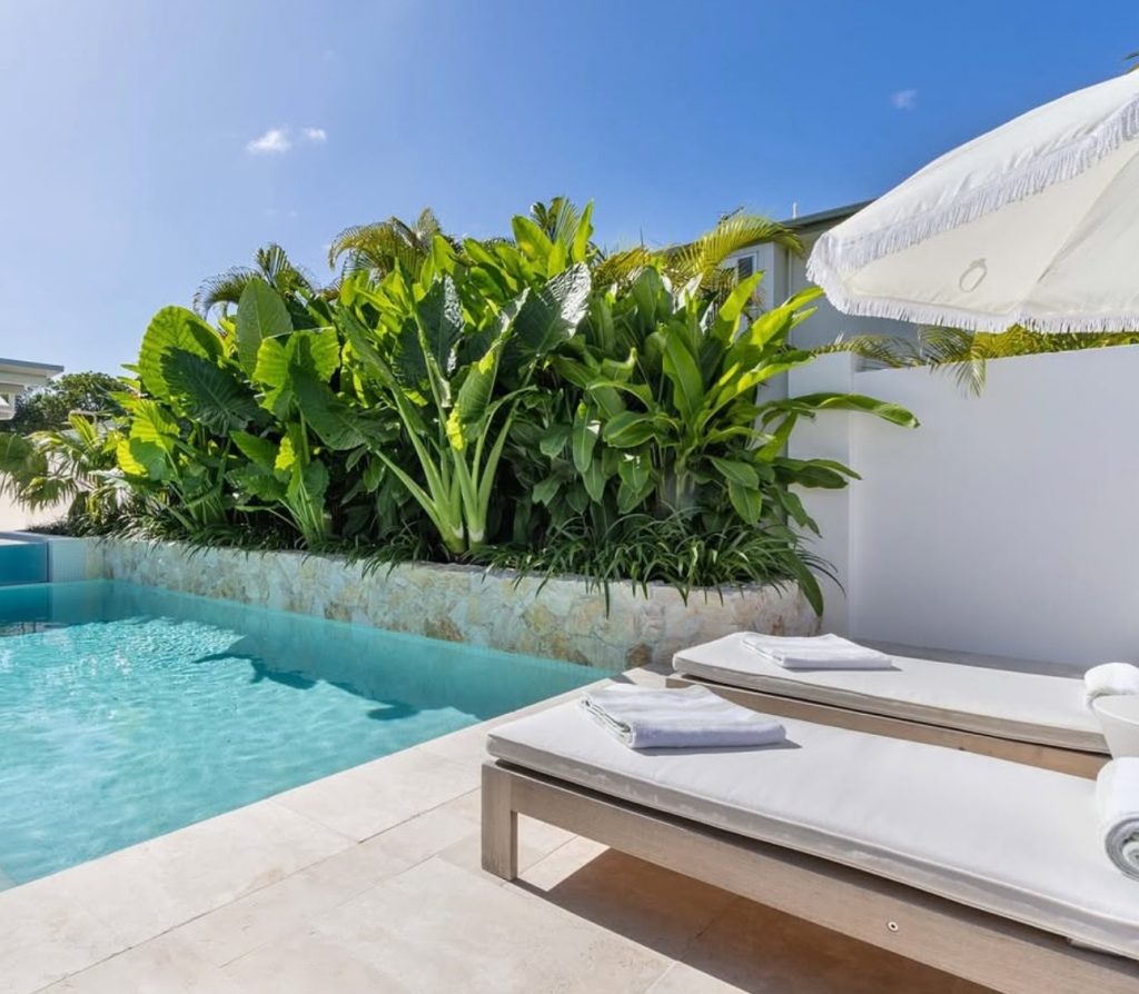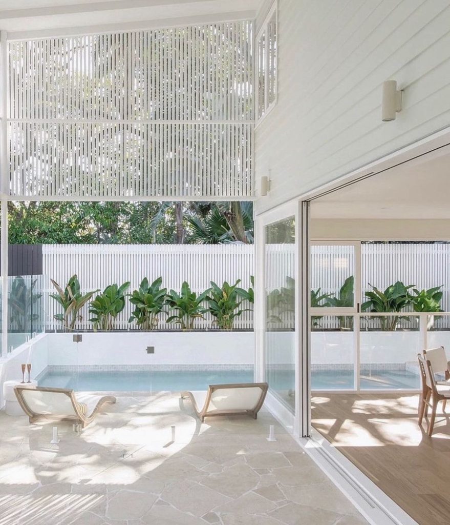 This airy layout merges indoor comfort with a breezy, sun-washed pool area, echoing subtle Mediterranean influences through white vertical slatting, light stone flooring, and minimalistic furniture. The row of structured green plants along the far edge brings color and life without disrupting the calming palette, proving you don’t need much to create a spa-like mood. It’s an inspiring example for homeowners exploring simple design ideas for compact plunge layouts, especially when aiming for spaces that feel modern, uncluttered, and easy to maintain.