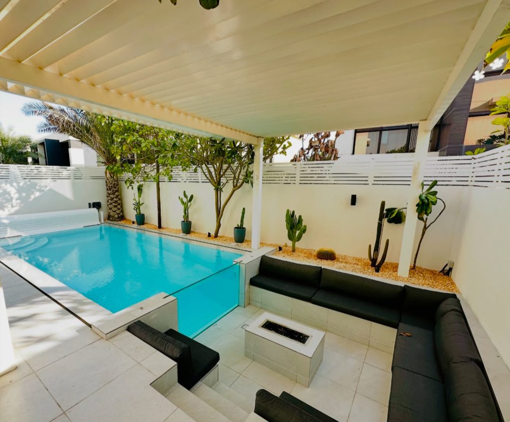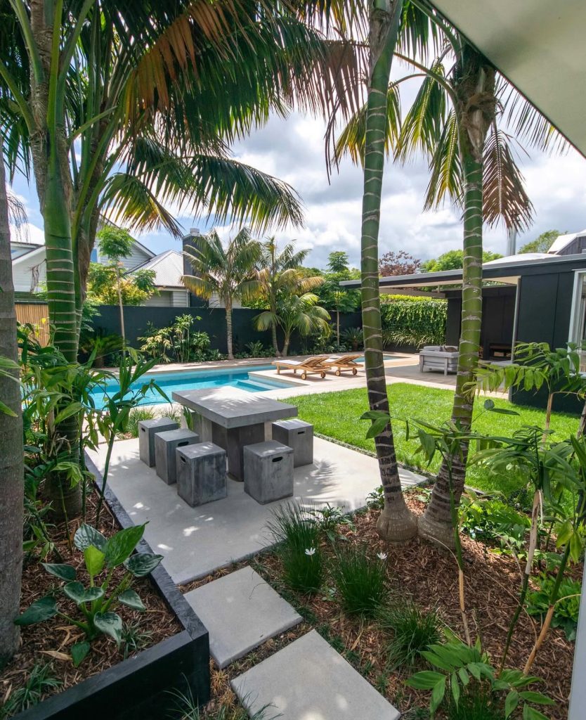 This inviting layout brings resort energy to everyday living with a central dining nook tucked between tall palms, leading toward a bright blue inground pool framed by an open lawn. The pairing of smooth concrete, timber accents, and layered plants creates a warm, modern look that feels both social and serene. It’s an inspiring direction for homeowners exploring backyard ideas that combine relaxation with entertaining, especially when they want a cohesive design that works for both weekdays and weekends.
