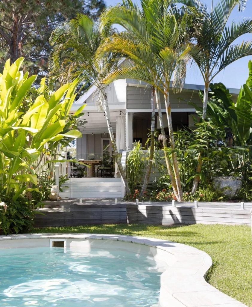 This warm, botanical setting feels reminiscent of classic Australian coastal homes, where layered greenery and relaxed outdoor living blend effortlessly with the shape of a kidney pool. The tall palms and dense tropical plants make the space feel grounded and intimate, while the raised deck offers a natural transition for gathering and dining. It’s a reminder that even simple upgrades—strategic greenery, curved lines, and natural textures—can transform everyday backyard layouts into personal retreats that feel lived-in and welcoming.