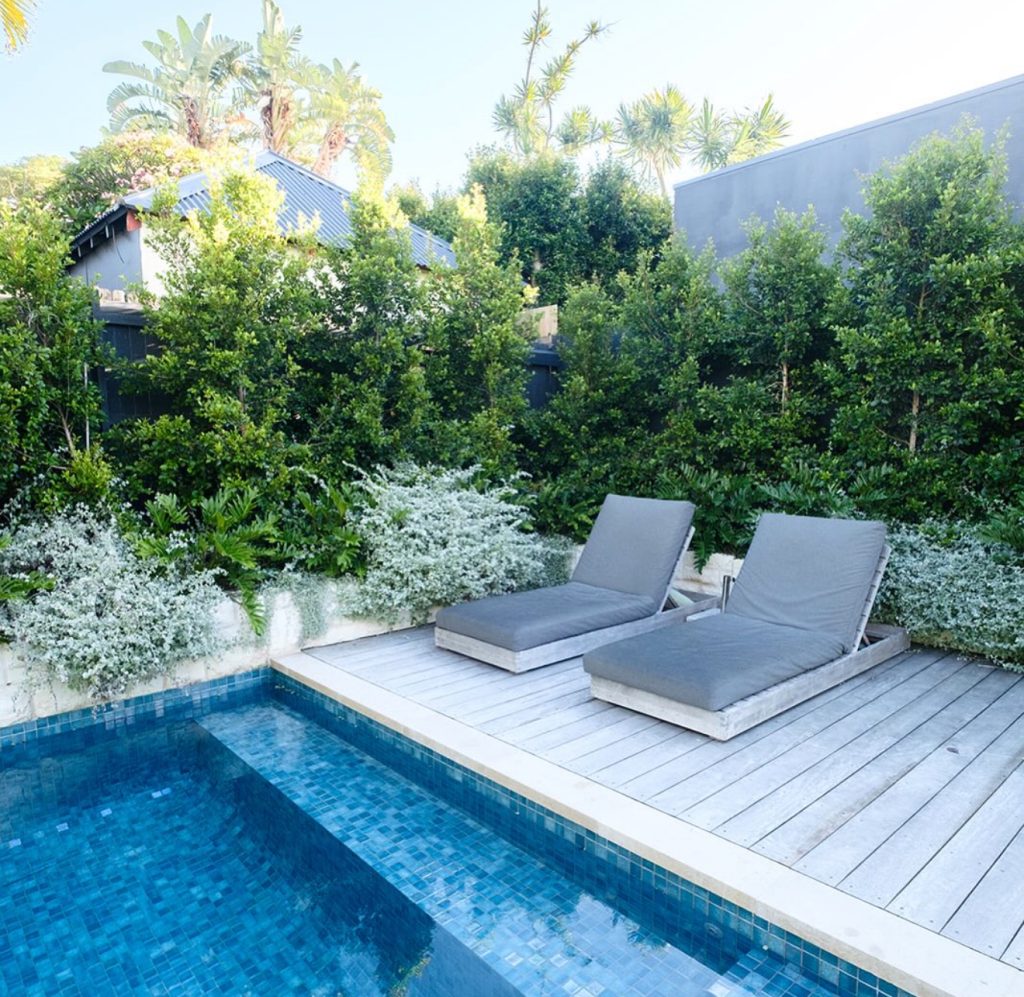 A contemporary mix of sleek decking and deep green foliage gives this layout a polished yet comfortable feeling, ideal for homeowners wanting simple landscaping that still makes an impact. The elevated lounge deck contrasts beautifully with the cool, blue mosaic of the swimming area, while structured hedges and soft silver plants create depth without clutter. This is a great direction for those exploring design ideas for a backyard above-ground makeover that still feels refined.