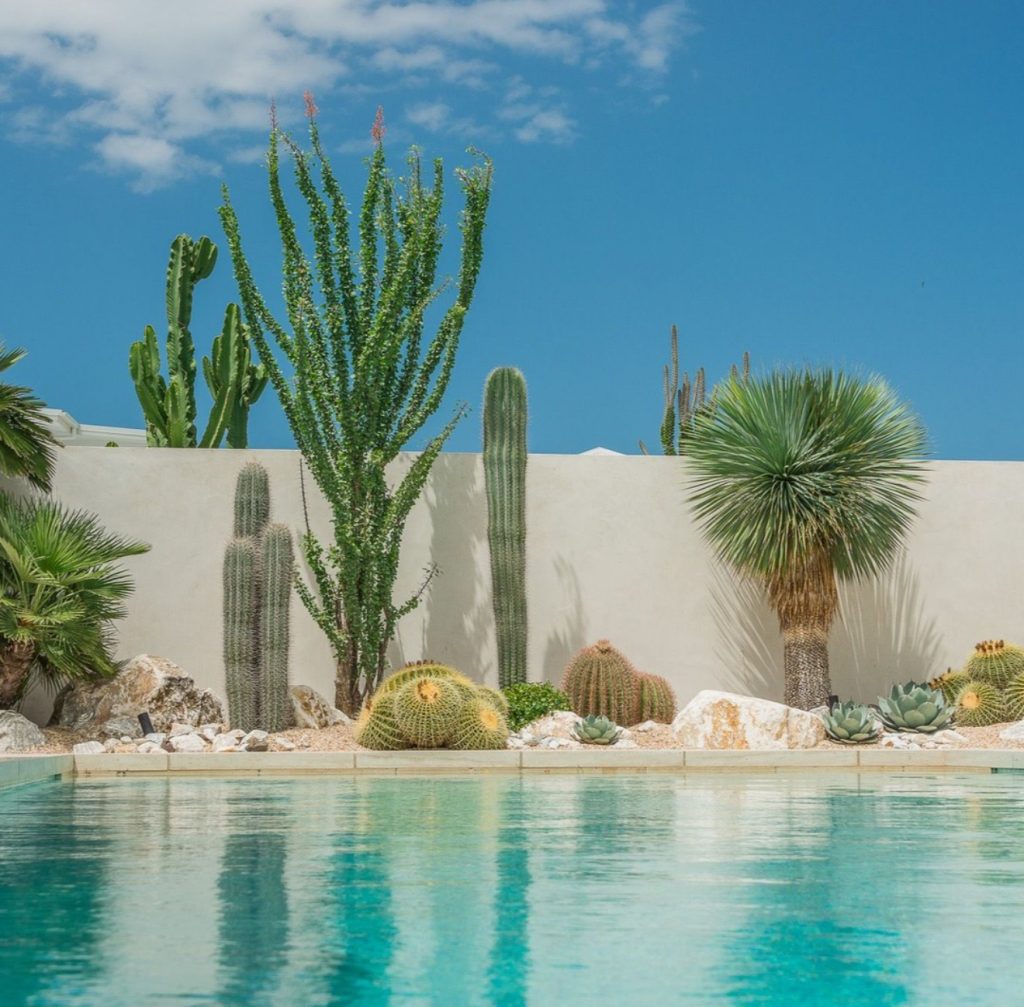 This striking setup blends desert minimalism with Mediterranean accents, using sculptural cacti, sun-loving succulents, and sandy stone elements to form a warm, architectural border around the pool. The combination is especially appealing for U.S. regions with dry climates and homeowners who want low-maintenance plants that still offer strong visual character. It’s a powerful reference for anyone considering ideas for a round or above-ground layout that feels artistic, bold, and climate-smart.