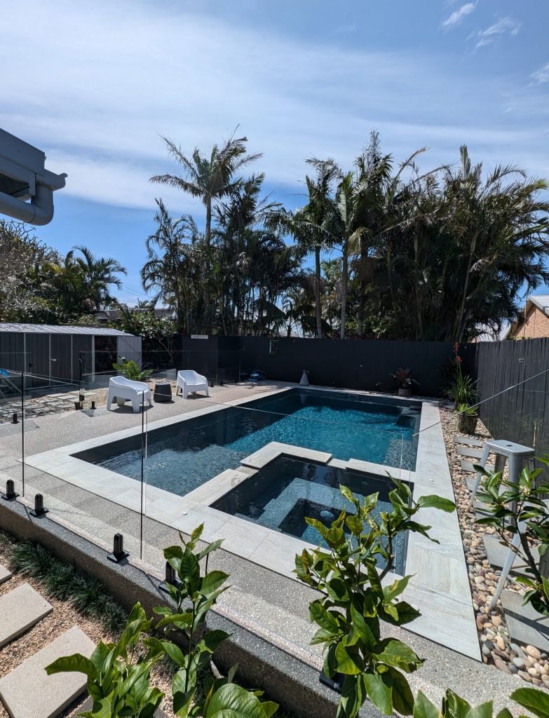 This layered inground layout creates a strong visual presence with its geometric pool-and-spa combination, framed by pale stone and a clean glass barrier that keeps the space feeling expansive. The tall palms rising behind the fence add a distinctly tropical character, creating the kind of leafy privacy Americans often look for when searching for backyard ideas that feel like a retreat without leaving home. Soft pebble beds, structured pavers, and young fruiting plants help balance the harder materials, showcasing how thoughtful design around a pool can make even a multifunction setup feel serene and modern.