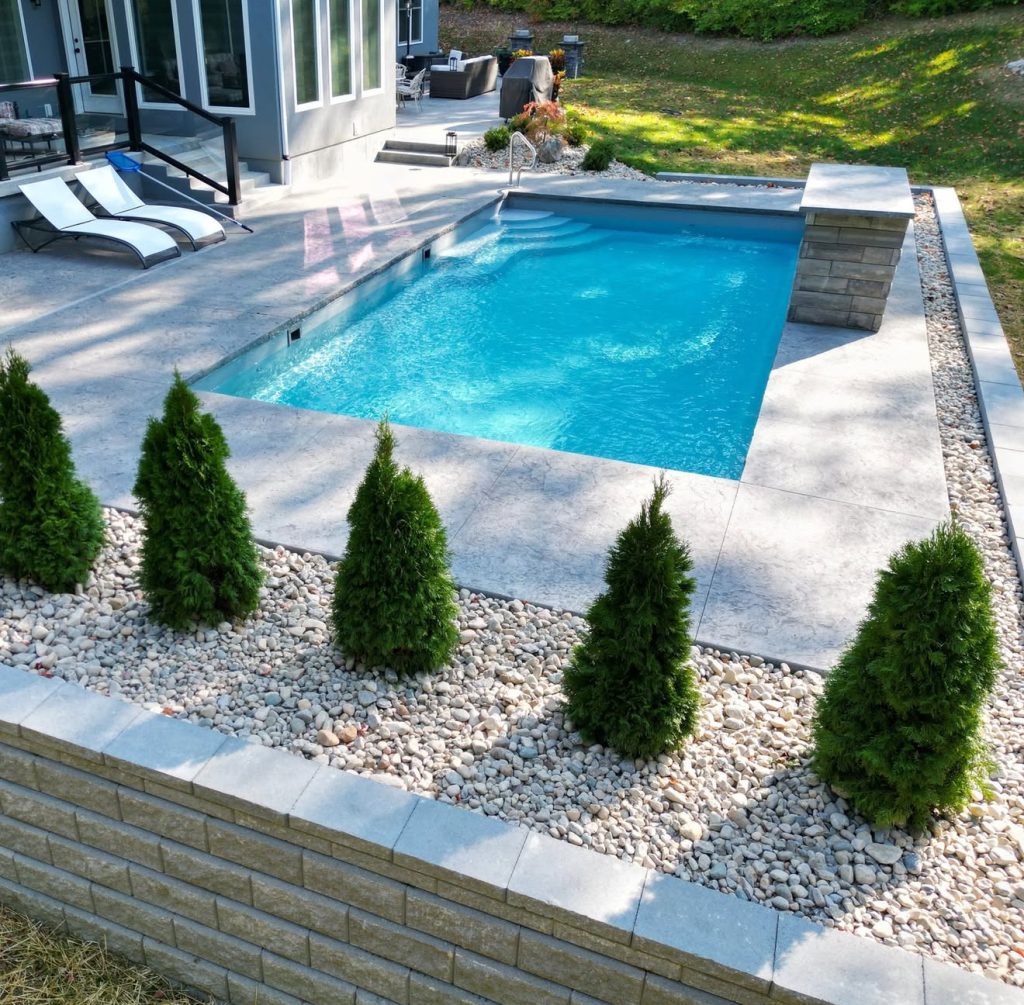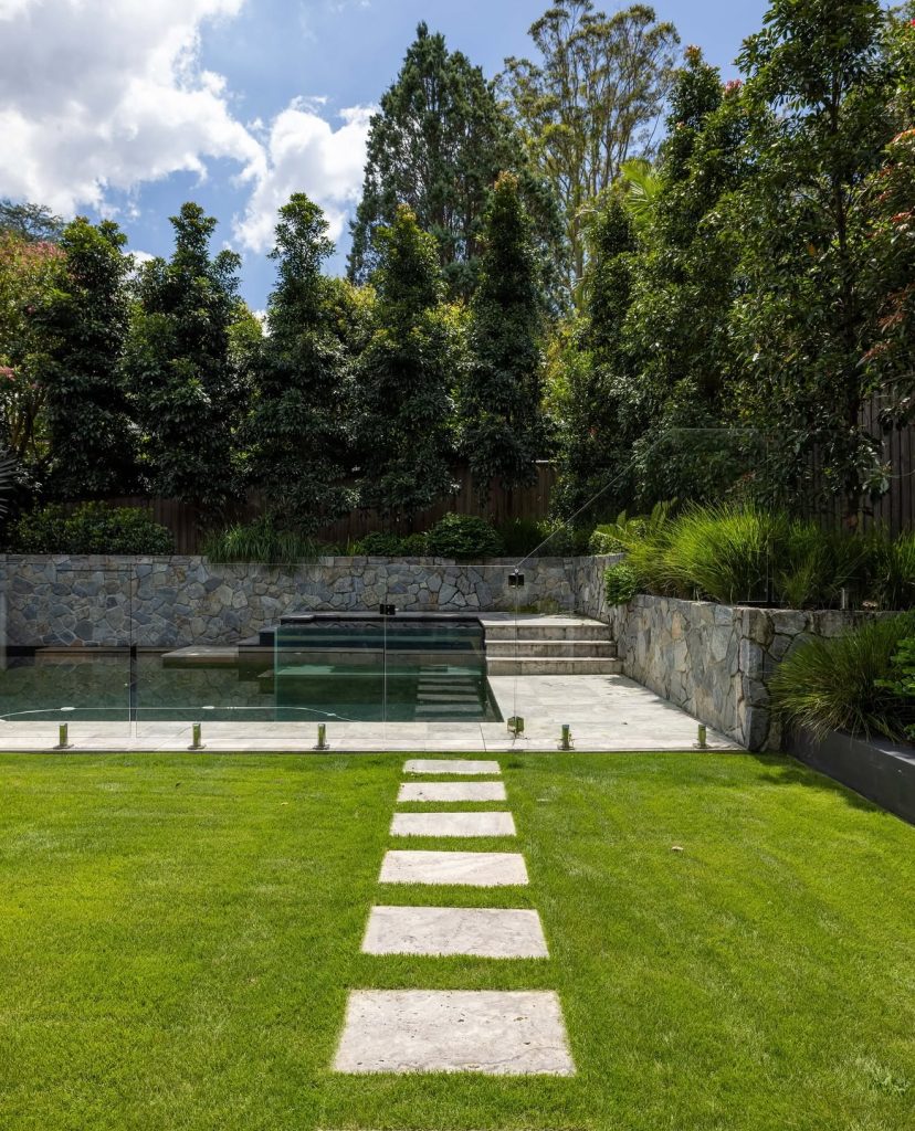 This design leans into natural textures, using stacked stone, lush hedging, and terraced levels to frame a peaceful swimming zone that blends into the landscape. The straight-line stepping stones across the lawn guide the movement intuitively, making the space feel curated without being overly formal. Homeowners looking for ideas for inground or slope-friendly design ideas will appreciate how the tiered retaining walls and dense plants create privacy while maintaining an organic look—something especially appealing for U.S. backyards bordered by woodland or larger shade trees.
