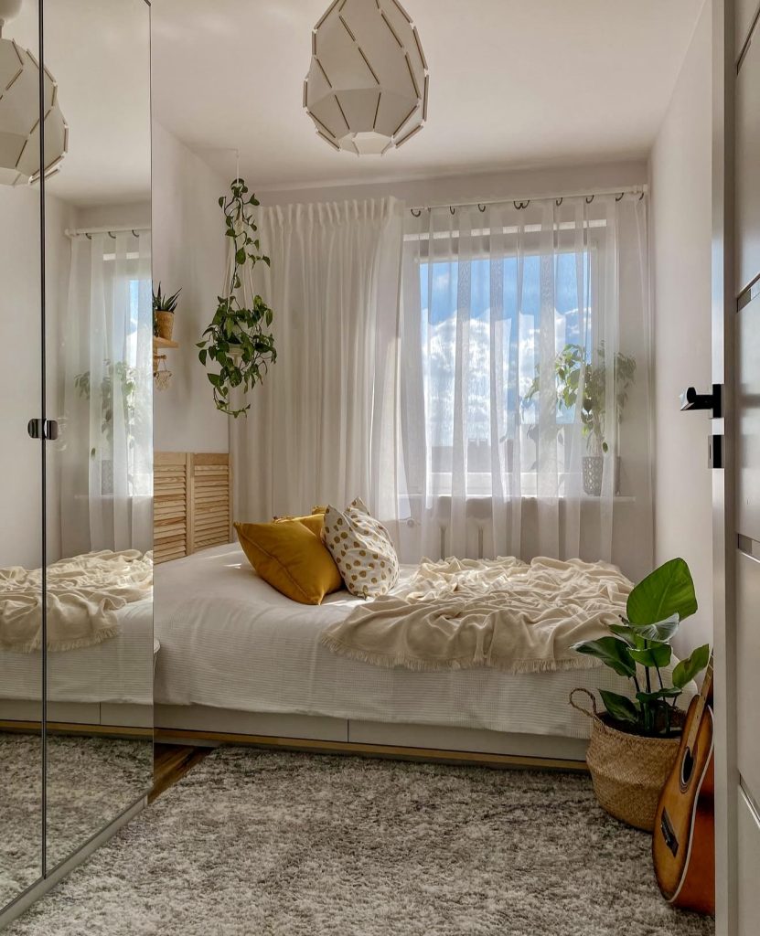 This bedroom captures the essence of cozy room decor through a gentle mix of cream tones, sunlight, and natural textures. The mirrored wardrobe expands the visual space, while layered bedding creates depth and comfort. Hanging greenery brings organic warmth and clever decor ideas without cluttering the floor. The mustard and patterned pillows add character, making the layout both cheerful and harmonious. It’s a perfect space for anyone seeking design ideas that balance serenity with modern minimalism.
