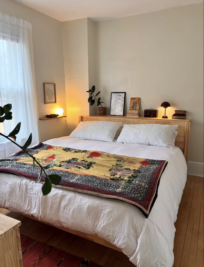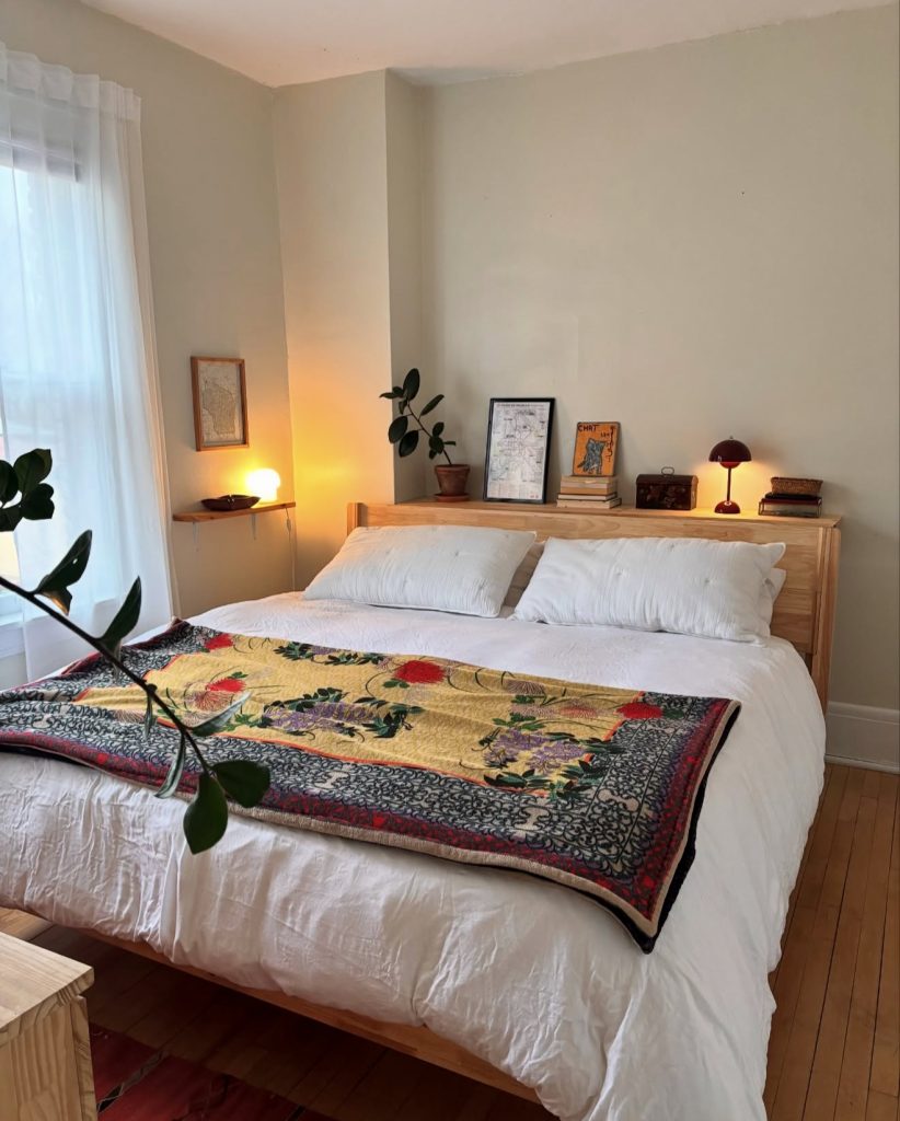 A vintage-inspired throw transforms this simple bedroom into a celebration of culture and color. The natural wood tones and white bedding offer a cozy foundation, while layered accents tell a story of travel and creativity. This room celebrates interior design freedom—mixing traditional patterns with minimalist furniture. Warm lamps and houseplants add life, creating a cozy room decor that feels both lived-in and inspiring. It’s an ideal setup for those who love to decorate with intention and individuality.