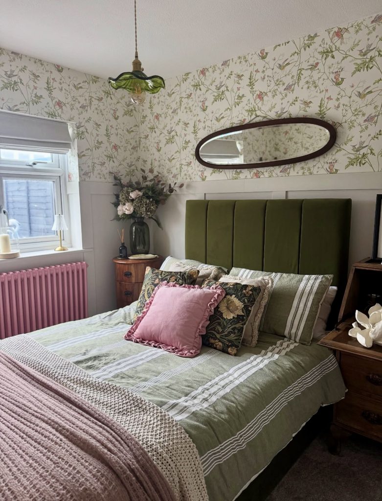 This charming bedroom blends vintage elegance with fresh, botanical energy. The green velvet headboard and pink accents create a sophisticated yet cozy feel, perfect for those drawn to English cottage decor ideas. Floral wallpaper adds dimension and nostalgia while maintaining an airy balance in a small layout. The soft layers of linen and knit textiles bring depth without overwhelming the space. It’s a beautiful example of interior design that feels romantic, personal, and timeless.